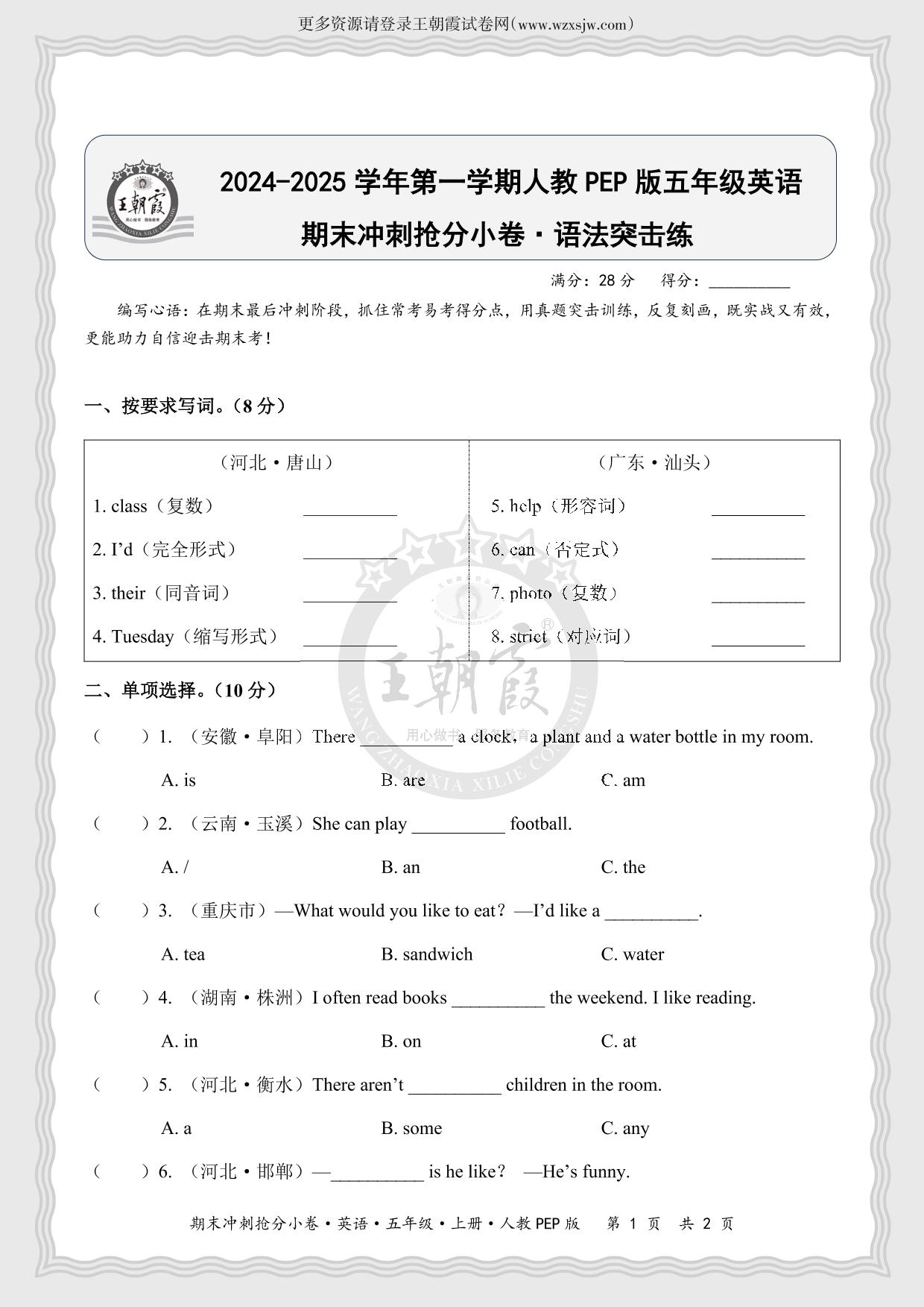 2024-2025学年第一学期五年级英语期末冲刺抢分小卷·语法突击练(人教PEP版)