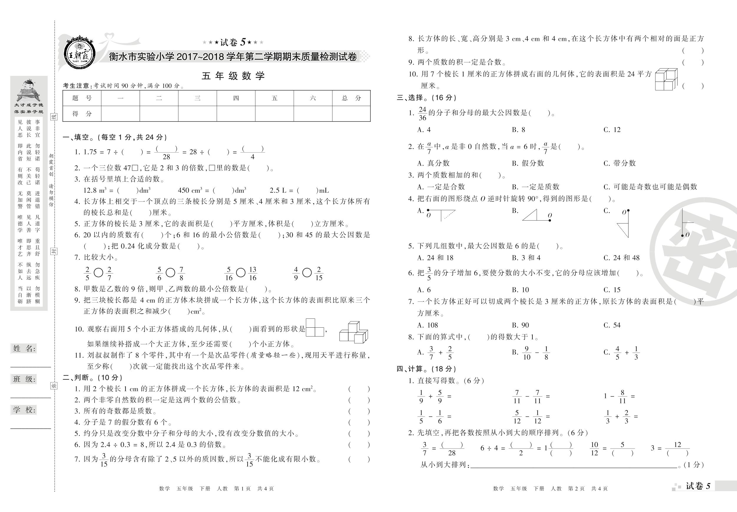 2017-2018学年第二学期衡水市实验小学五年级数学试卷(人教版)【5】
