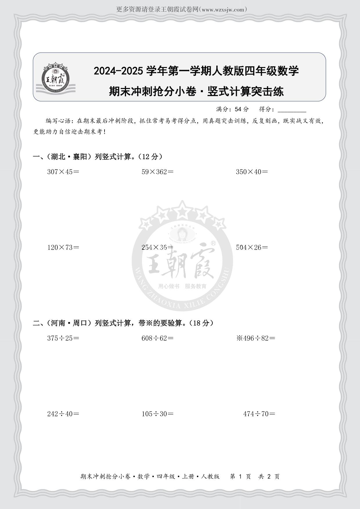 2024-2025学年第一学期四年级数学期末冲刺抢分小卷·竖式计算突击练(人教版)