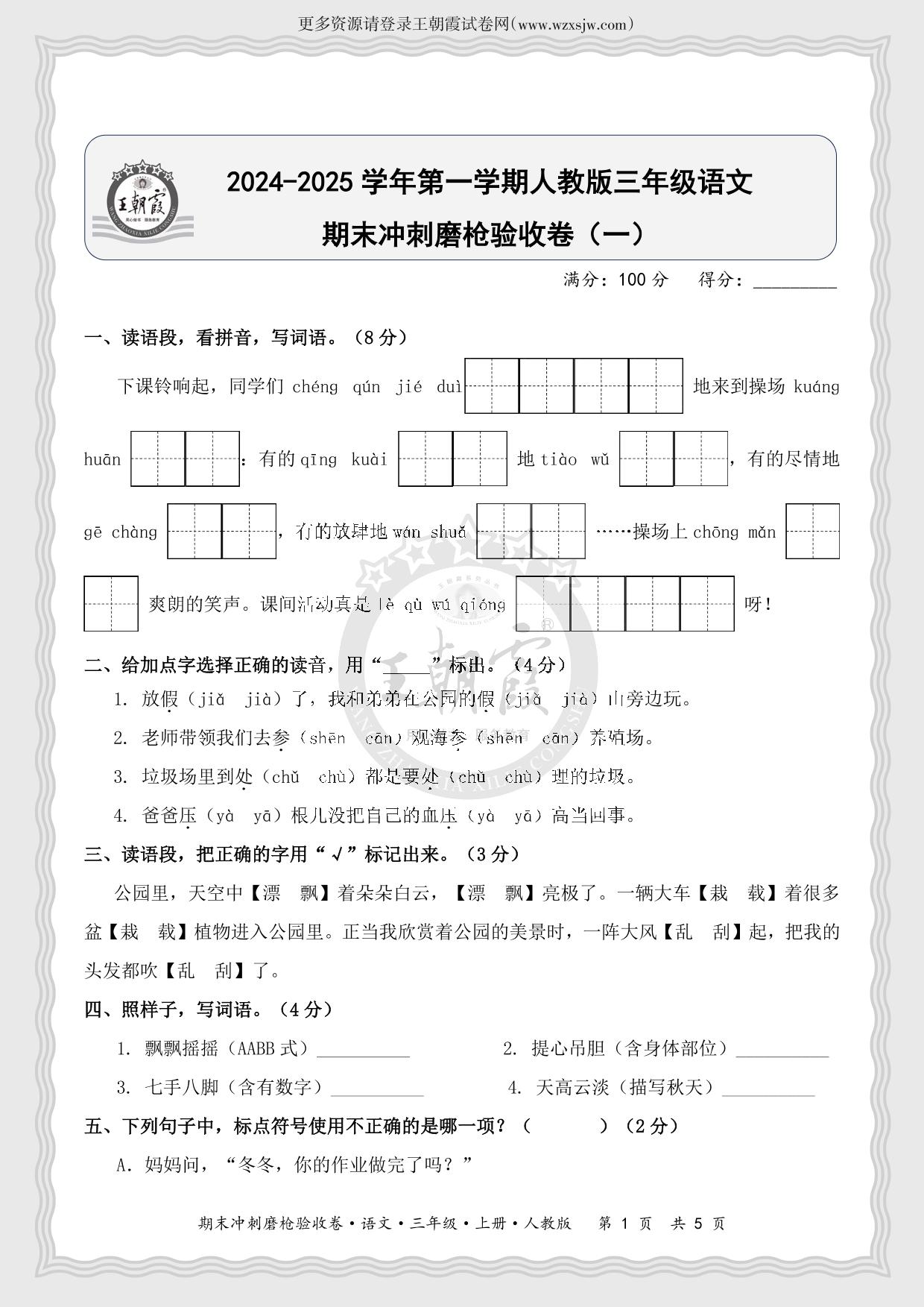 2024-2025学年第一学期三年级语文期末冲刺磨枪验收卷(一)(人教版)
