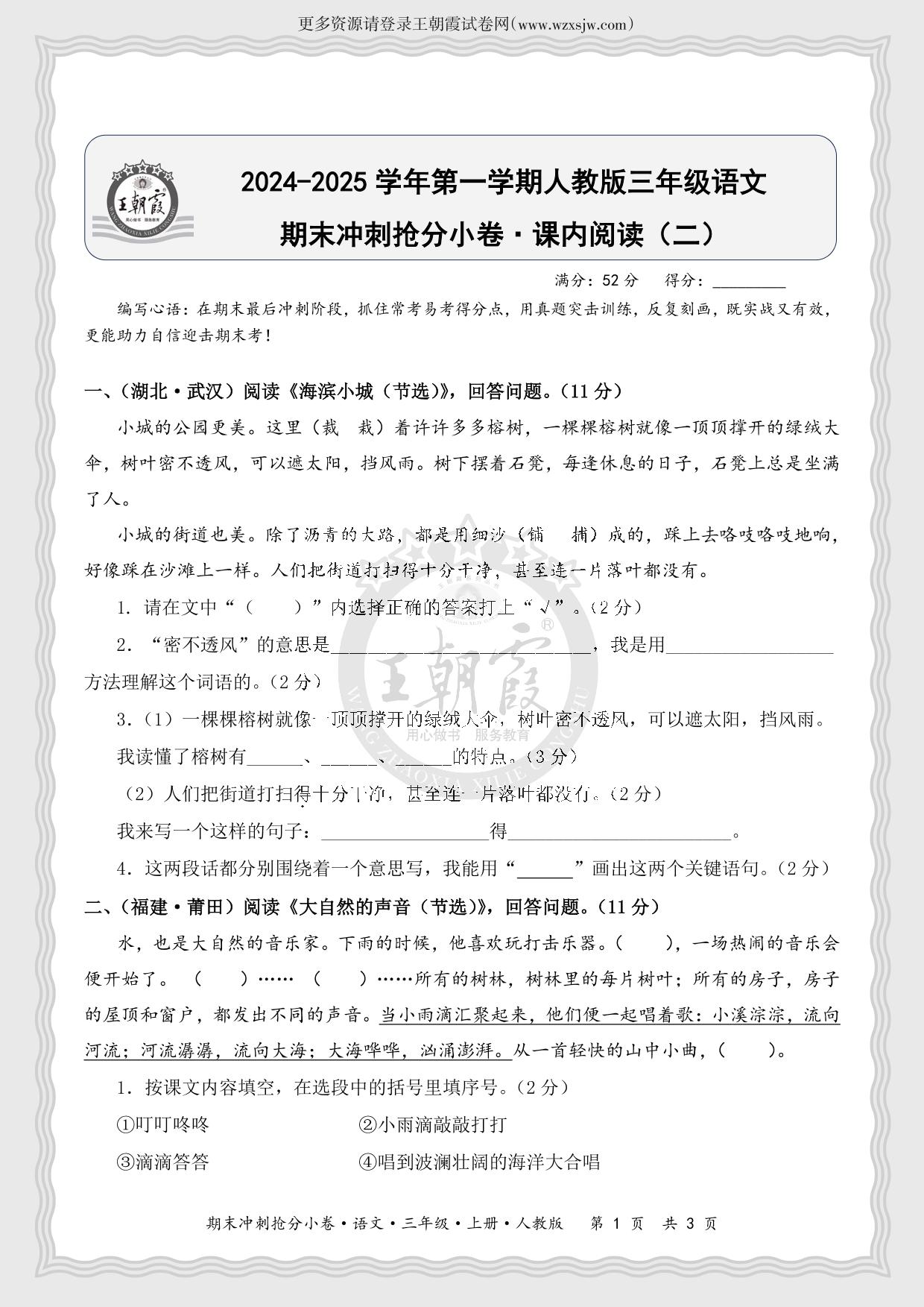 2024-2025学年第一学期三年级语文期末冲刺抢分小卷·课内阅读(二)(人教版)