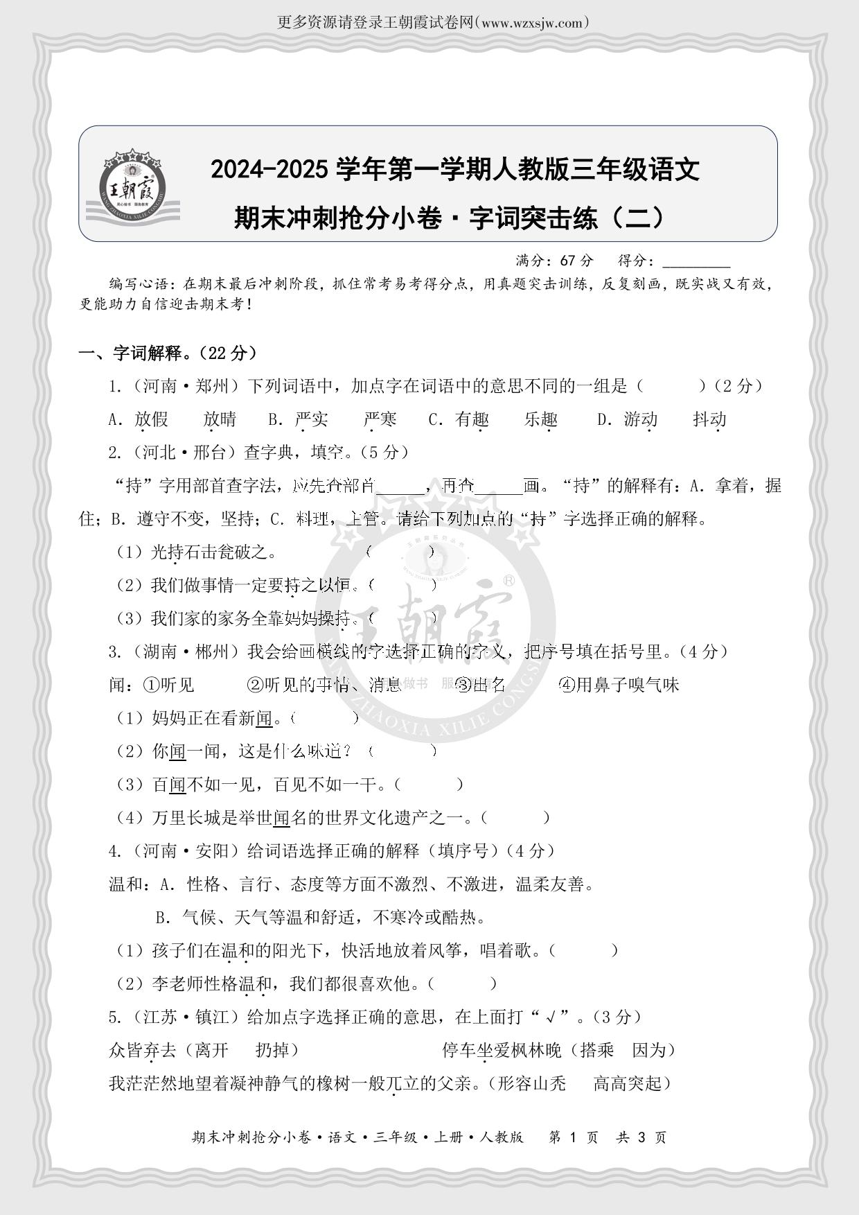 2024-2025学年第一学期三年级语文期末冲刺抢分小卷·字词突击练(二)(人教版)