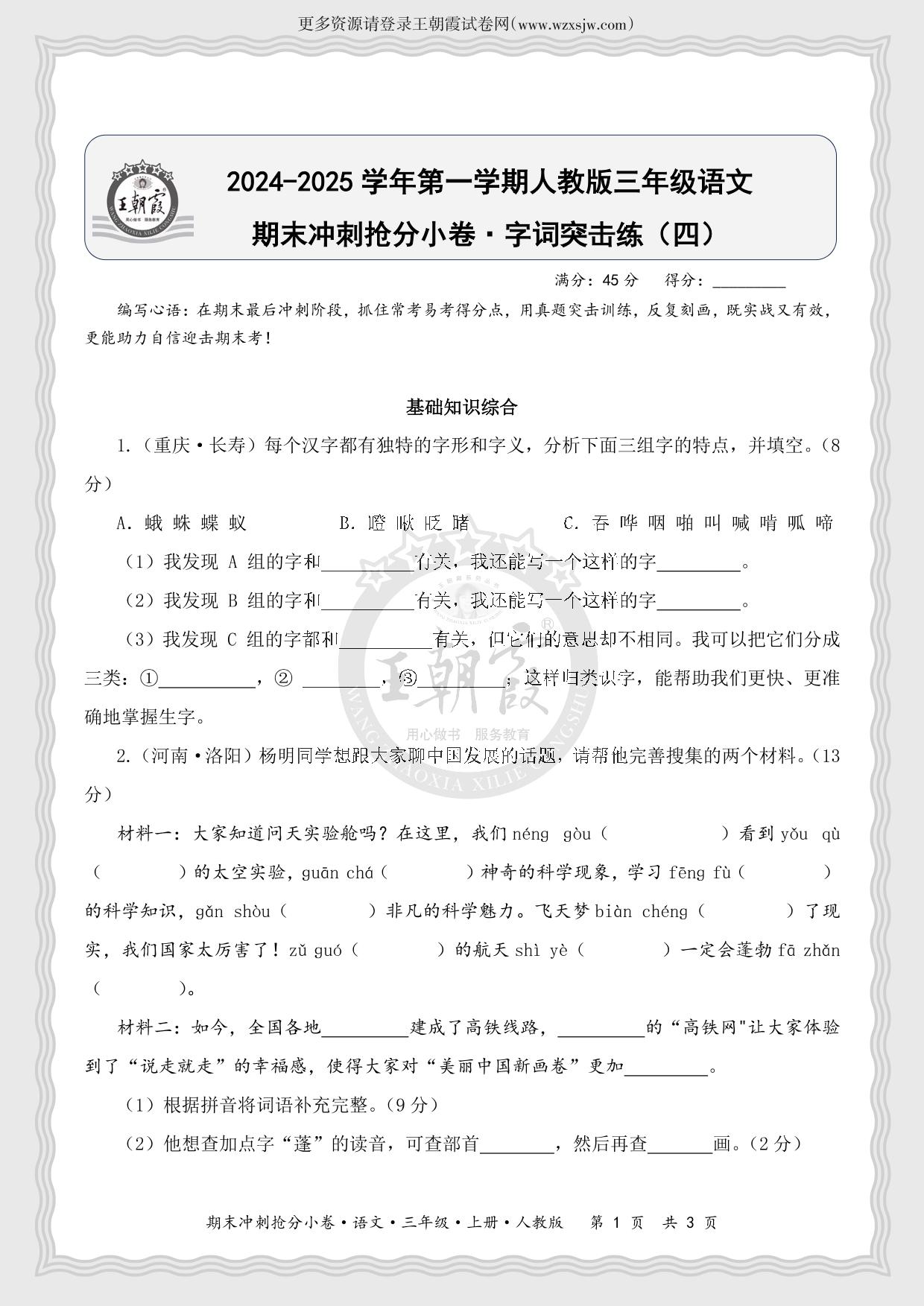 2024-2025学年第一学期三年级语文期末冲刺抢分小卷·字词突击练(四)(人教版)