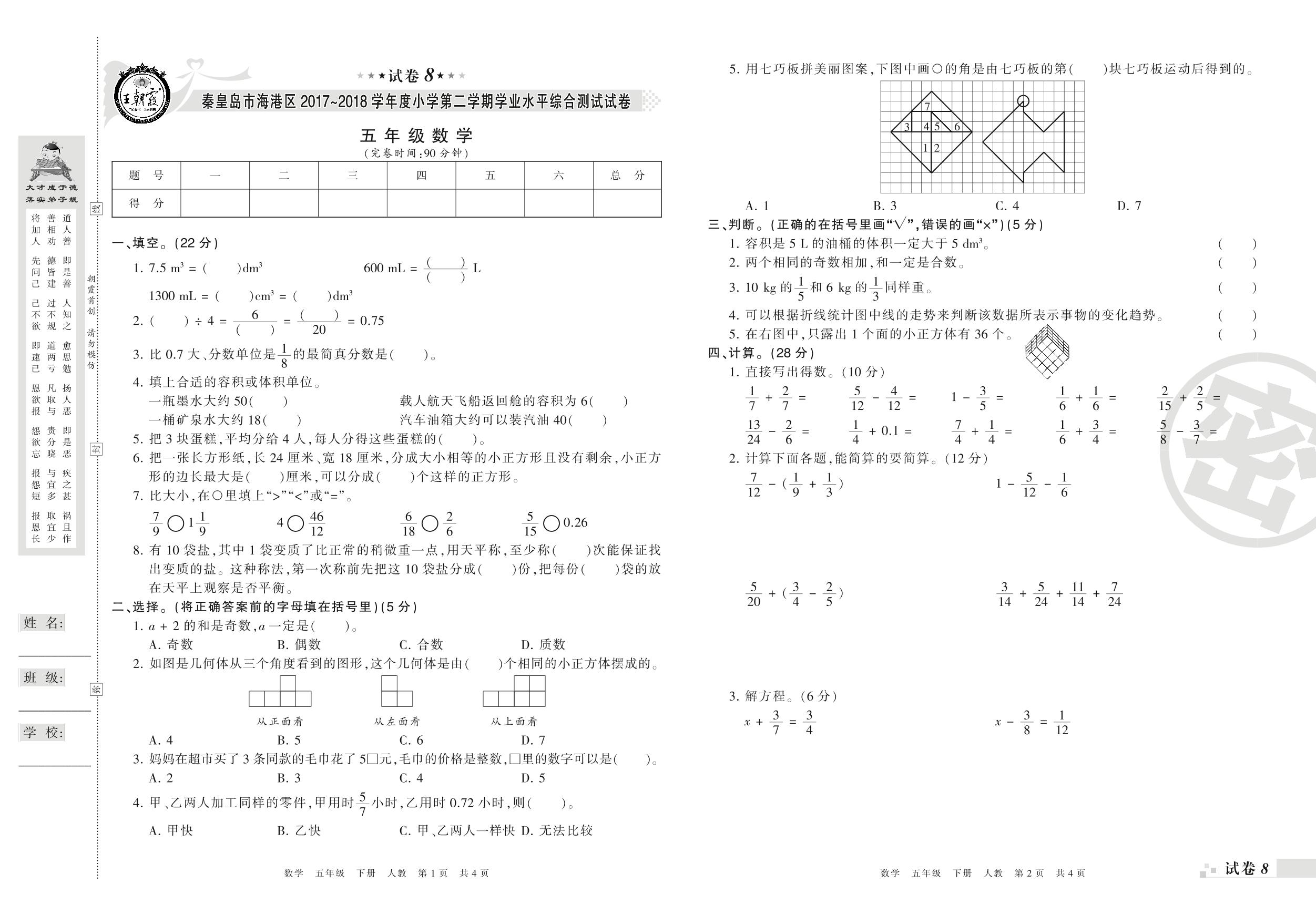 2017-2018学年第二学期秦皇岛市海港区五年级数学试卷(人教版)【8】