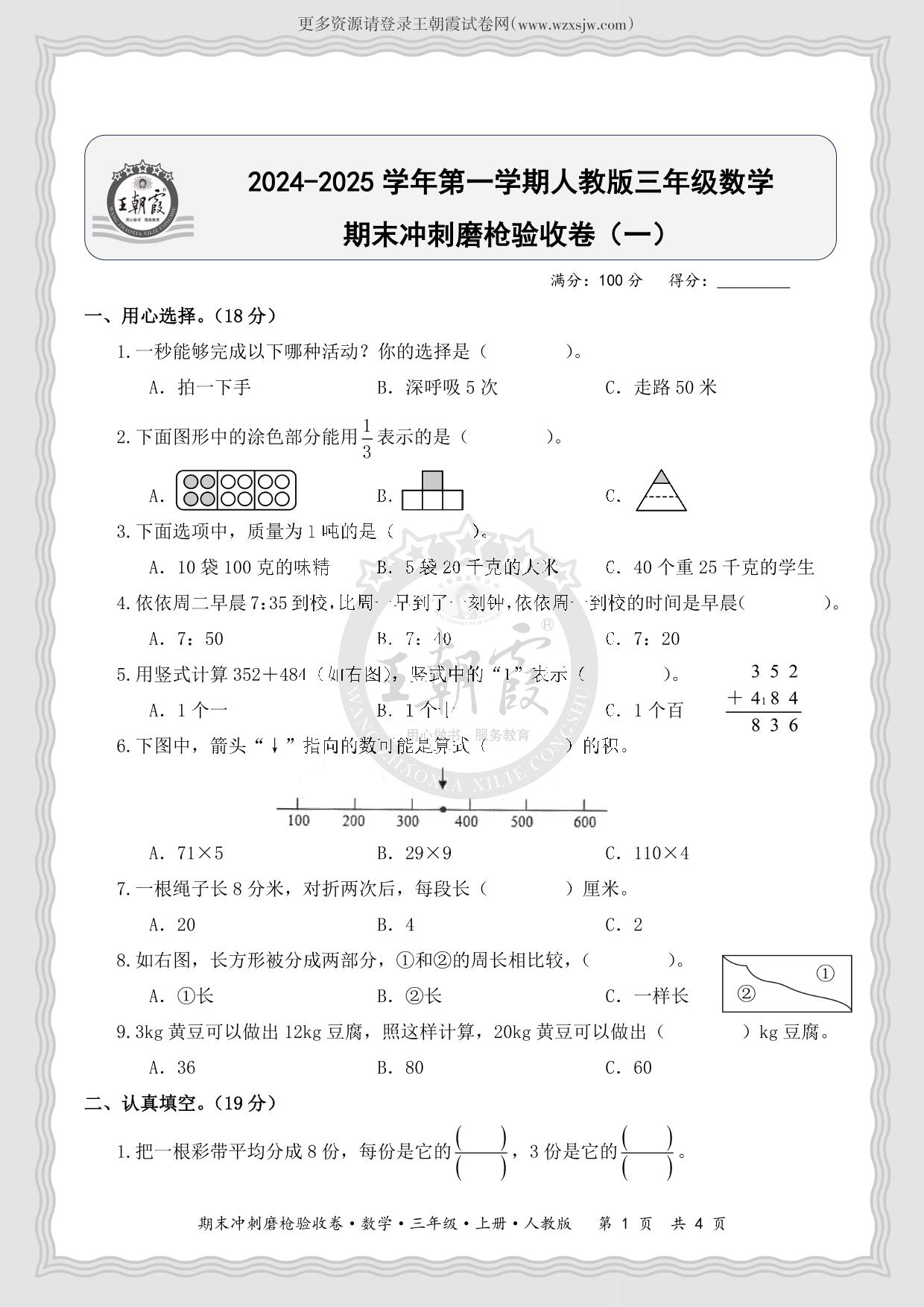 2024-2025学年第一学期三年级数学期末冲刺磨枪验收卷(一)(人教版)
