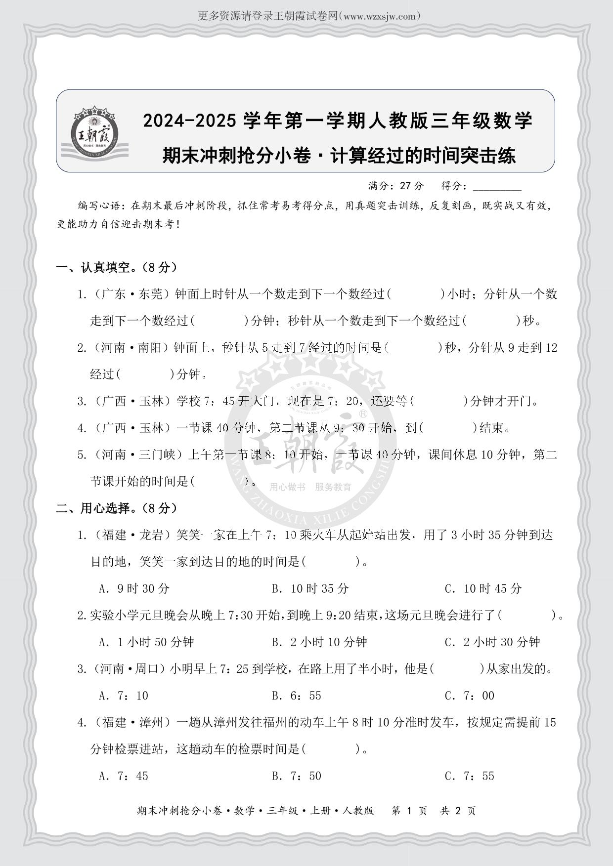2024-2025学年第一学期三年级数学期末冲刺抢分小卷·计算经过的时间突击练(人教版)