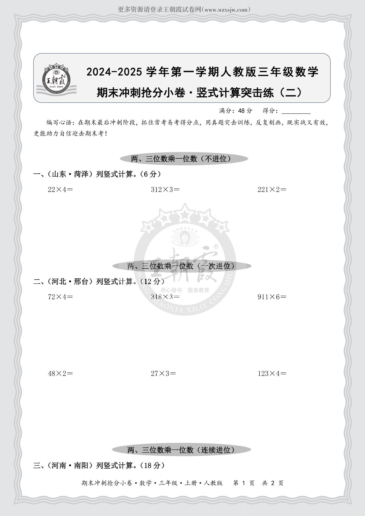 2024-2025学年第一学期三年级数学期末冲刺抢分小卷·竖式计算突击练(二)(人教版)