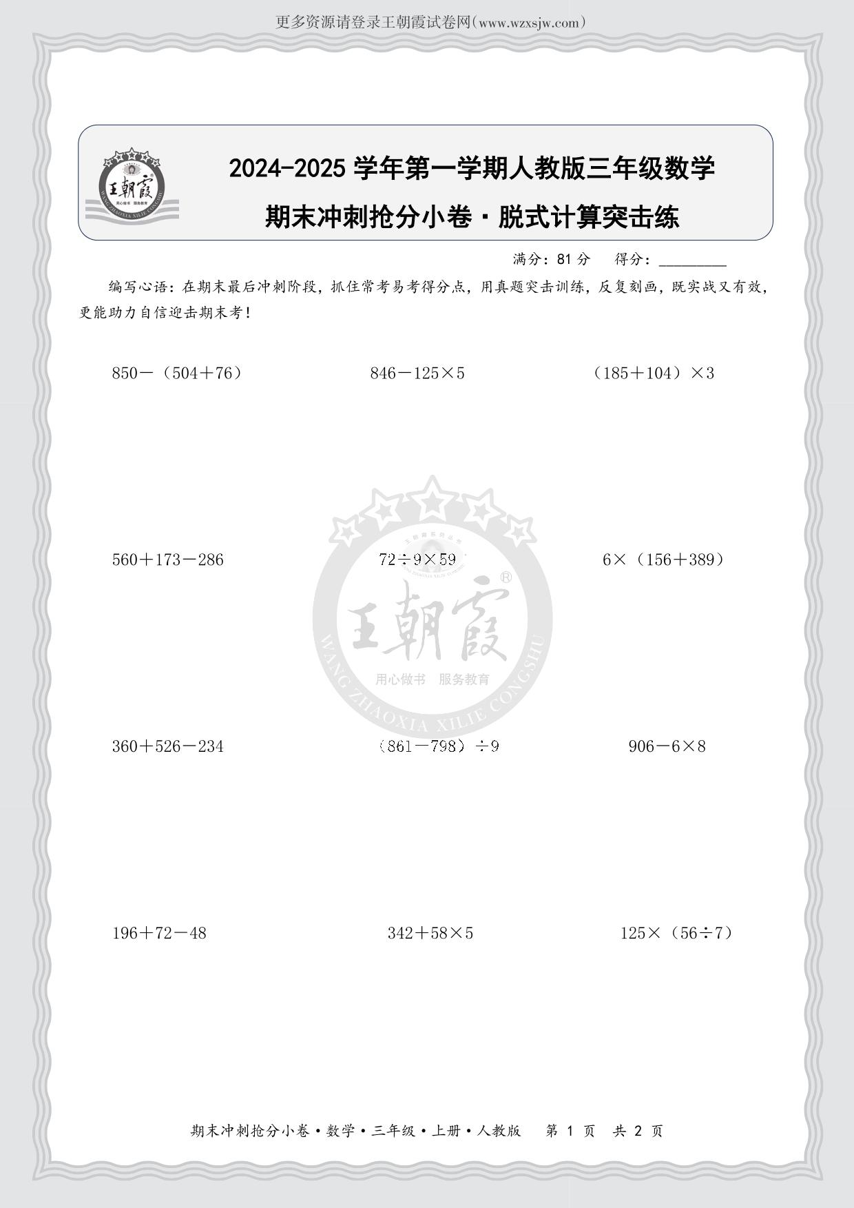 2024-2025学年第一学期三年级数学期末冲刺抢分小卷·脱式计算突击练(人教版)