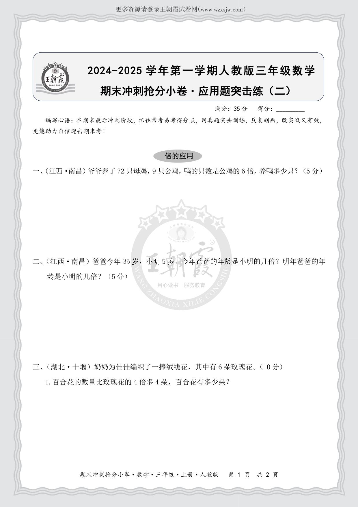 2024-2025学年第一学期三年级数学期末冲刺抢分小卷·应用题突击练(二)(人教版)
