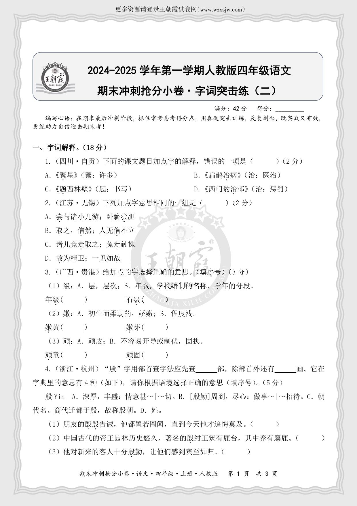 2024-2025学年第一学期四年级语文期末冲刺抢分小卷·字词突击练(二)(人教版)