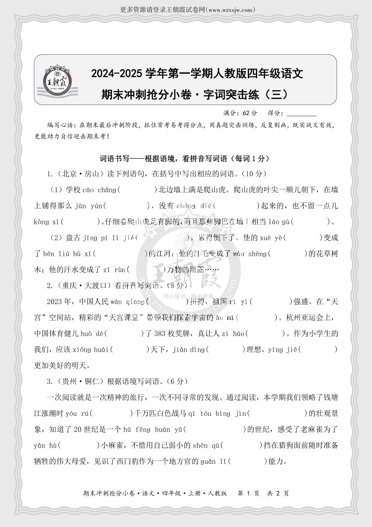 2024-2025学年第一学期四年级语文期末冲刺抢分小卷·字词突击练(三)(人教版)