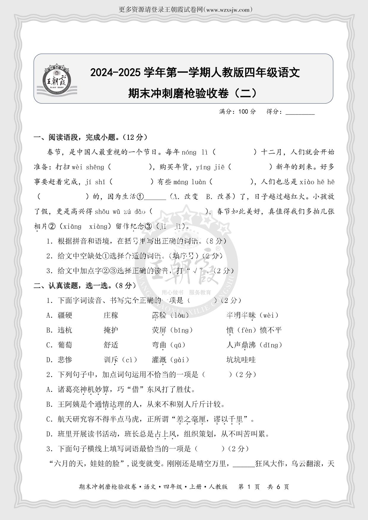 2024-2025学年第一学期四年级语文期末冲刺磨枪验收卷(二)(人教版)