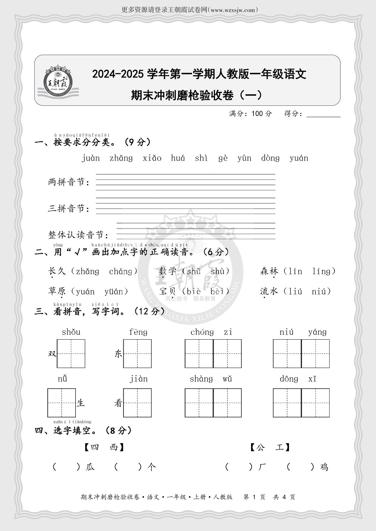 2024-2025学年第一学期一年级语文期末冲刺磨枪验收卷(一)(人教版)111