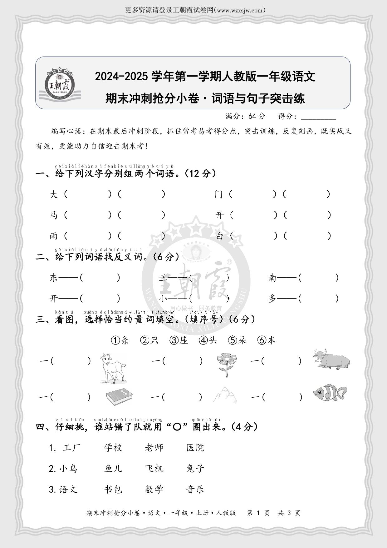2024-2025学年第一学期一年级语文期末冲刺抢分小卷·词语与句子突击练(人教版)