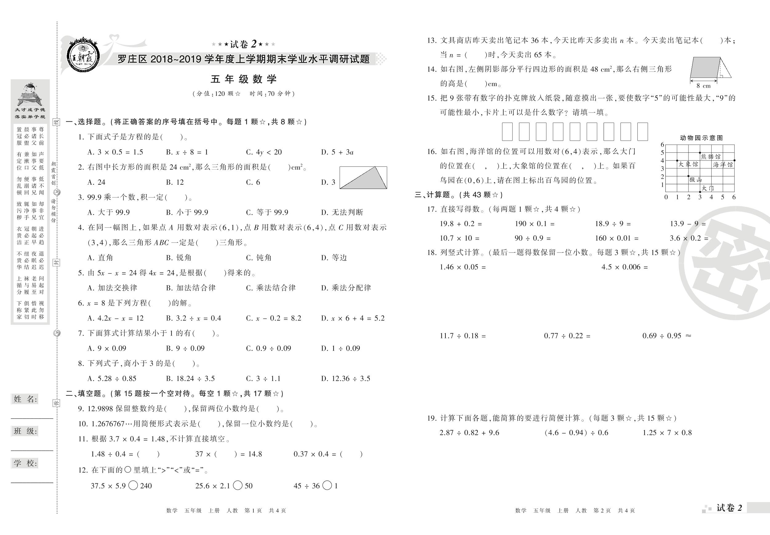 2018-2019学年第一学期临沂市罗庄区五年级数学试卷(人教版)【2】
