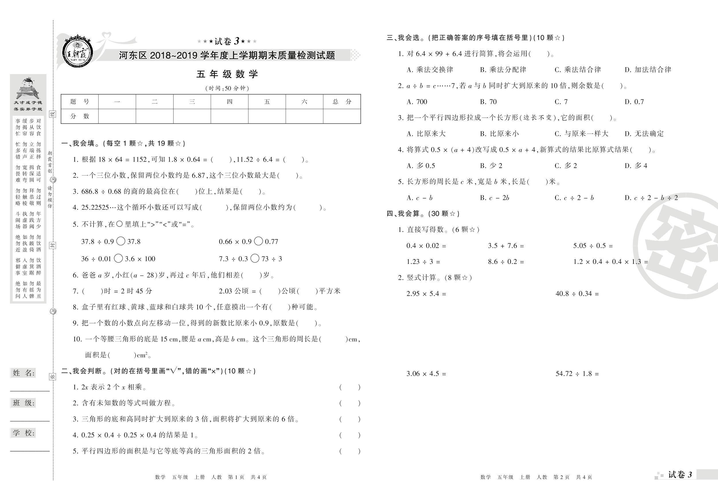 2018-2019学年第一学期临沂市河东区五年级数学试卷(人教版)【3】