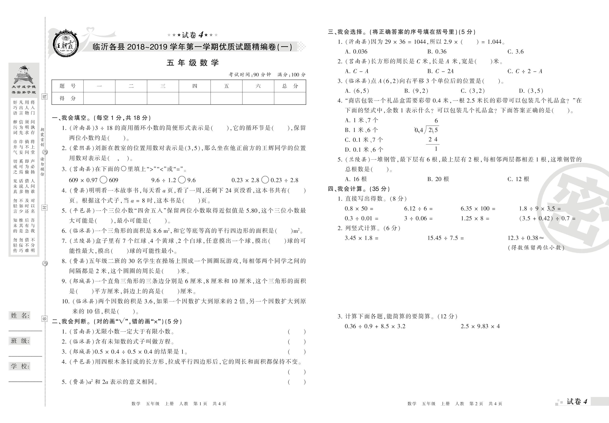 2018-2019学年第一学期临沂市各县优质试题精编卷(一)五年级数学试卷(人教版)【4】