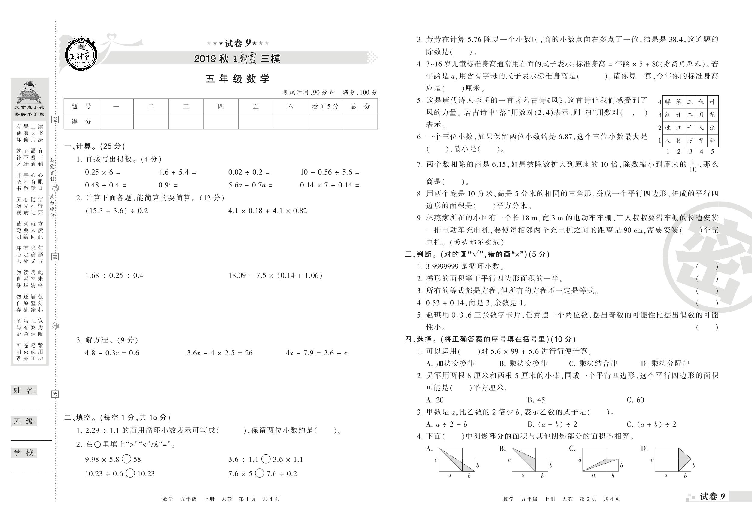 王朝霞期末模拟卷五年级上册数学(人教版)_R210804173548【9】