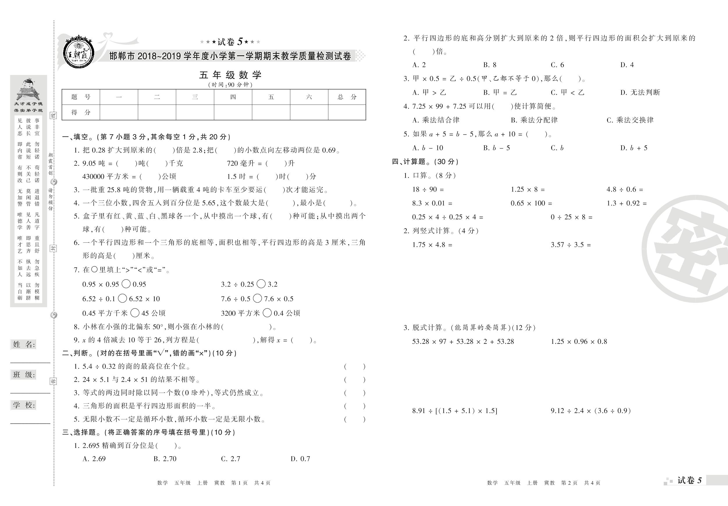 2018-2019学年第一学期邯郸市五年级数学试卷(冀教版)【5】