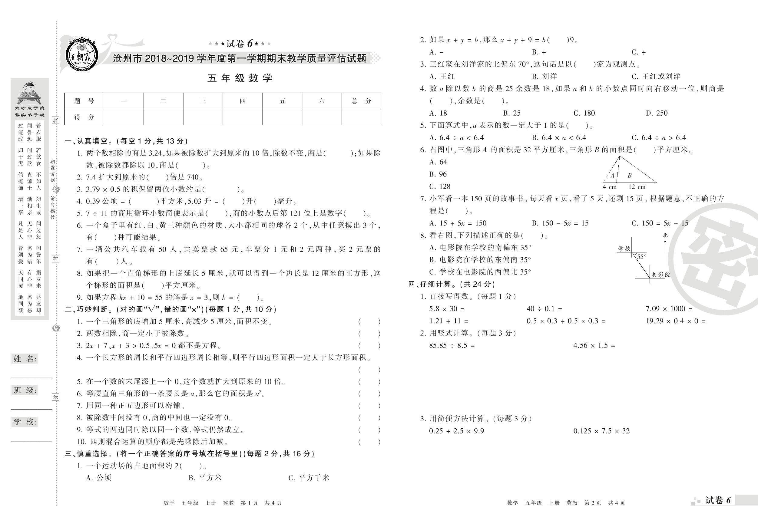 2018-2019学年第一学期沧州市五年级数学试卷(冀教版)【6】