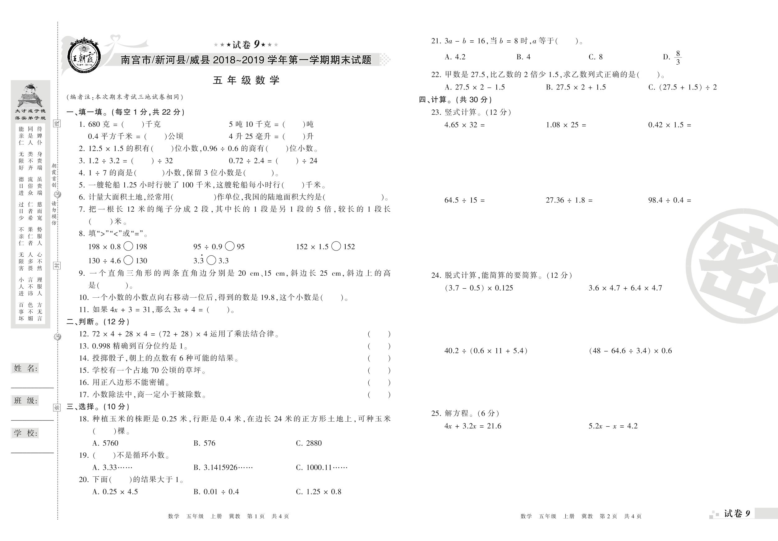 2018-2019学年第一学期南宫市、新河县、威县五年级数学试卷(冀教版)【9】