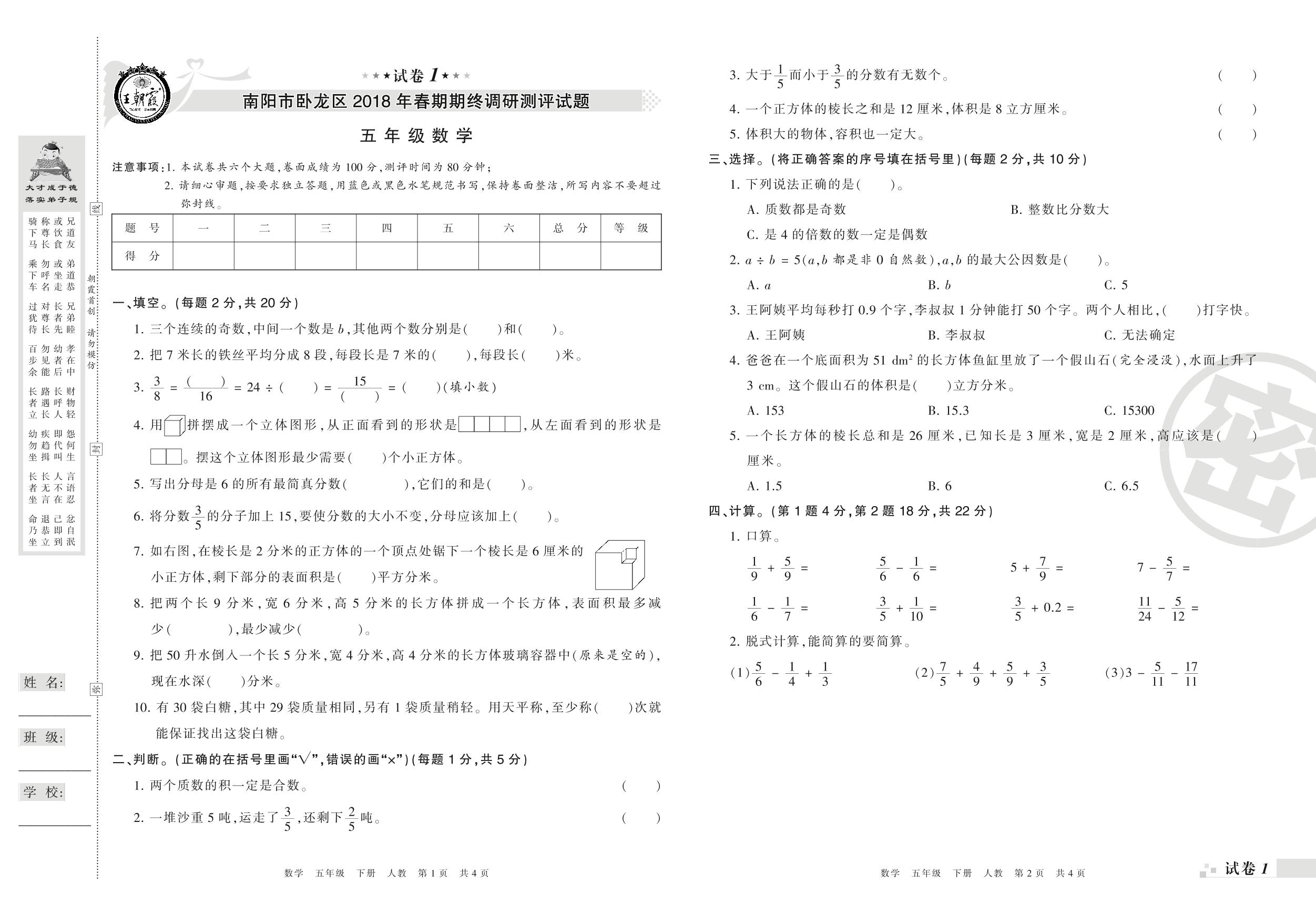 2017-2018学年第二学期南阳市卧龙区五年级数学试卷(人教版)【1】