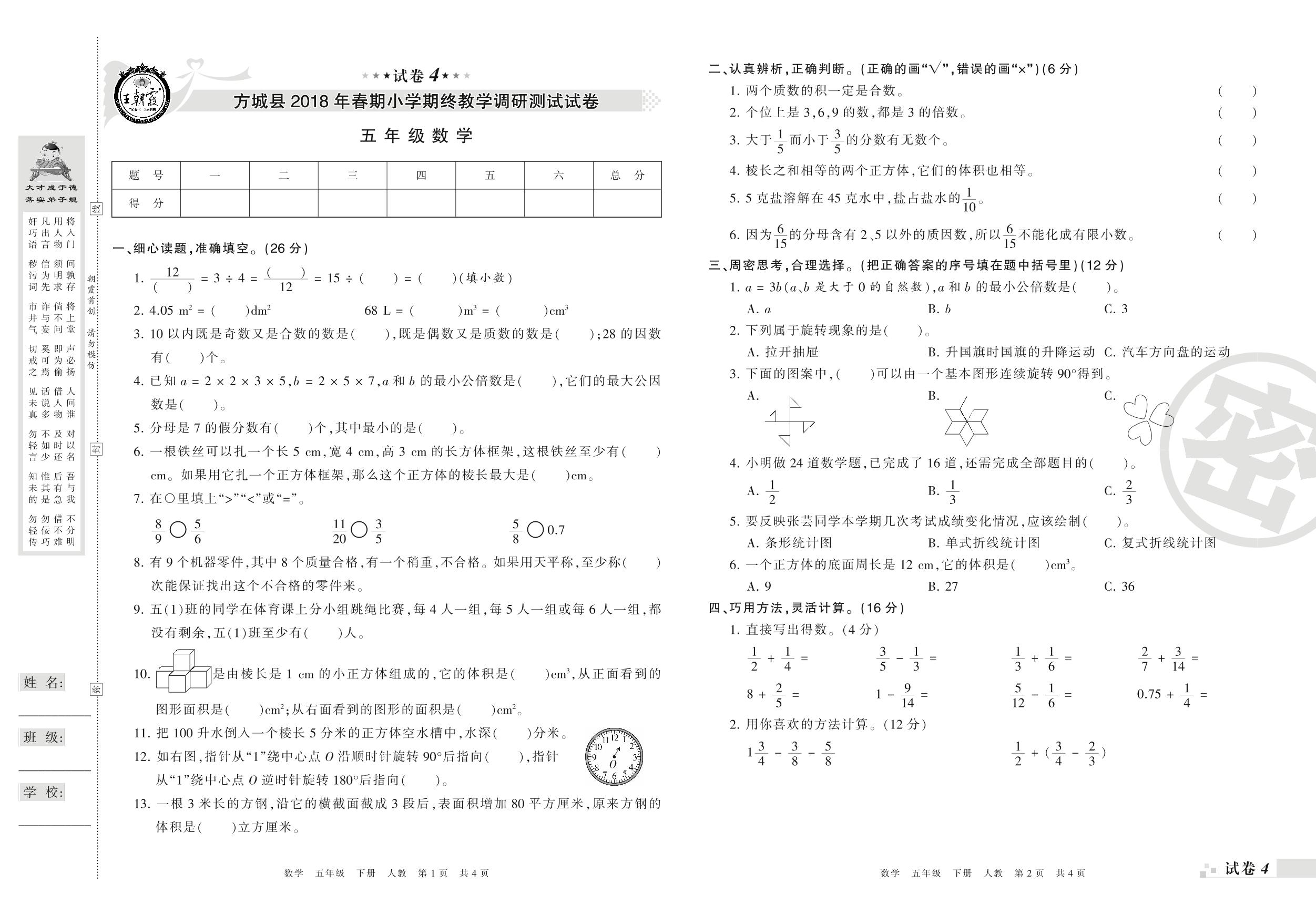 2017-2018学年第二学期南阳市方城县五年级数学试卷(人教版)【4】