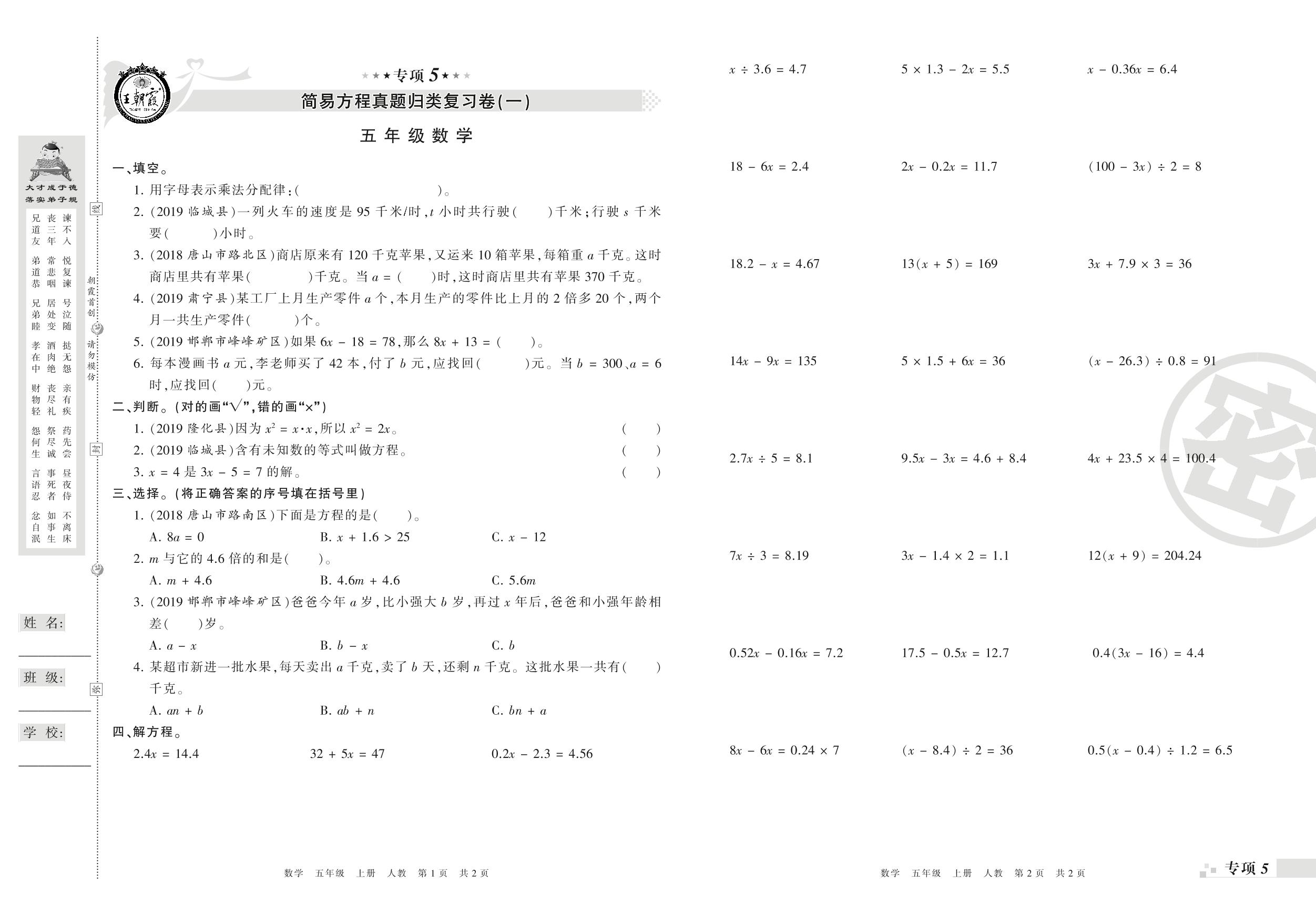 王朝霞期末专项卷——简易方程真题归类复习五年级上册数学(人教版)_R210804173721【0】