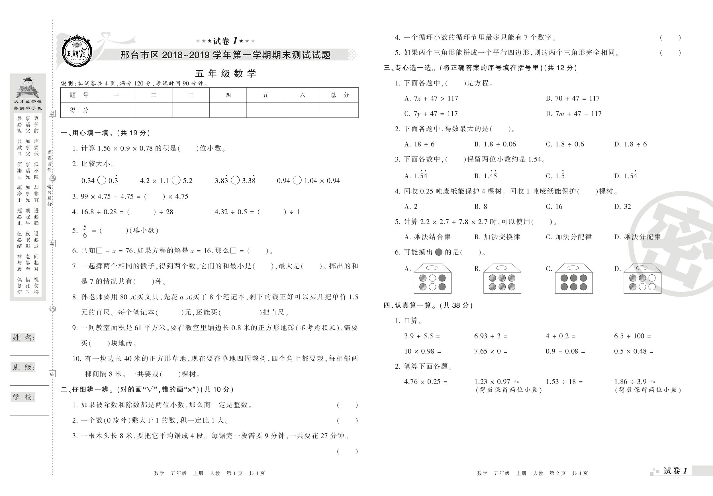 2018-2019学年第一学期邢台市区五年级数学试卷(人教版)【1】