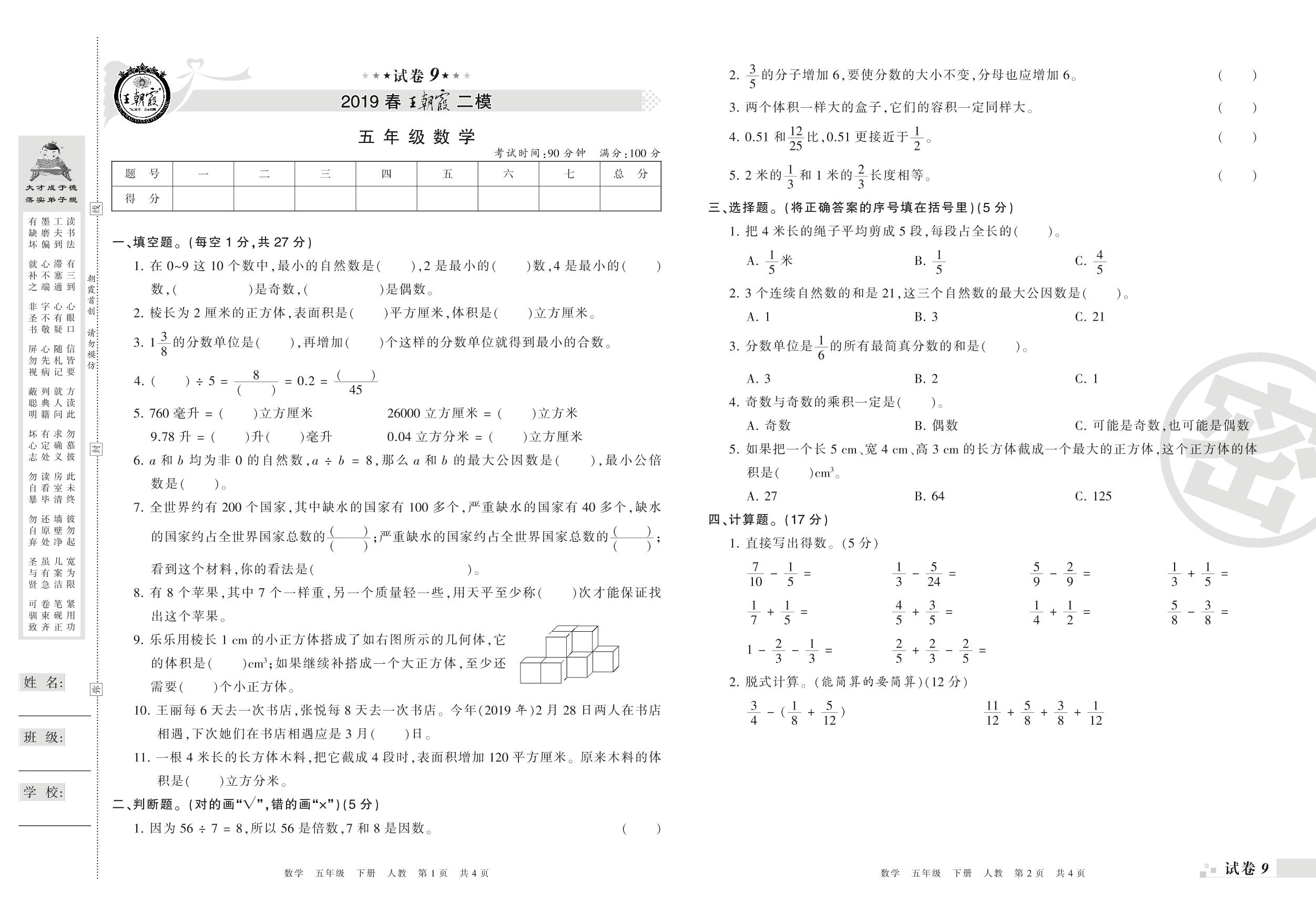 王朝霞期末模拟卷五年级下册数学(人教版)_R210804173834【9】