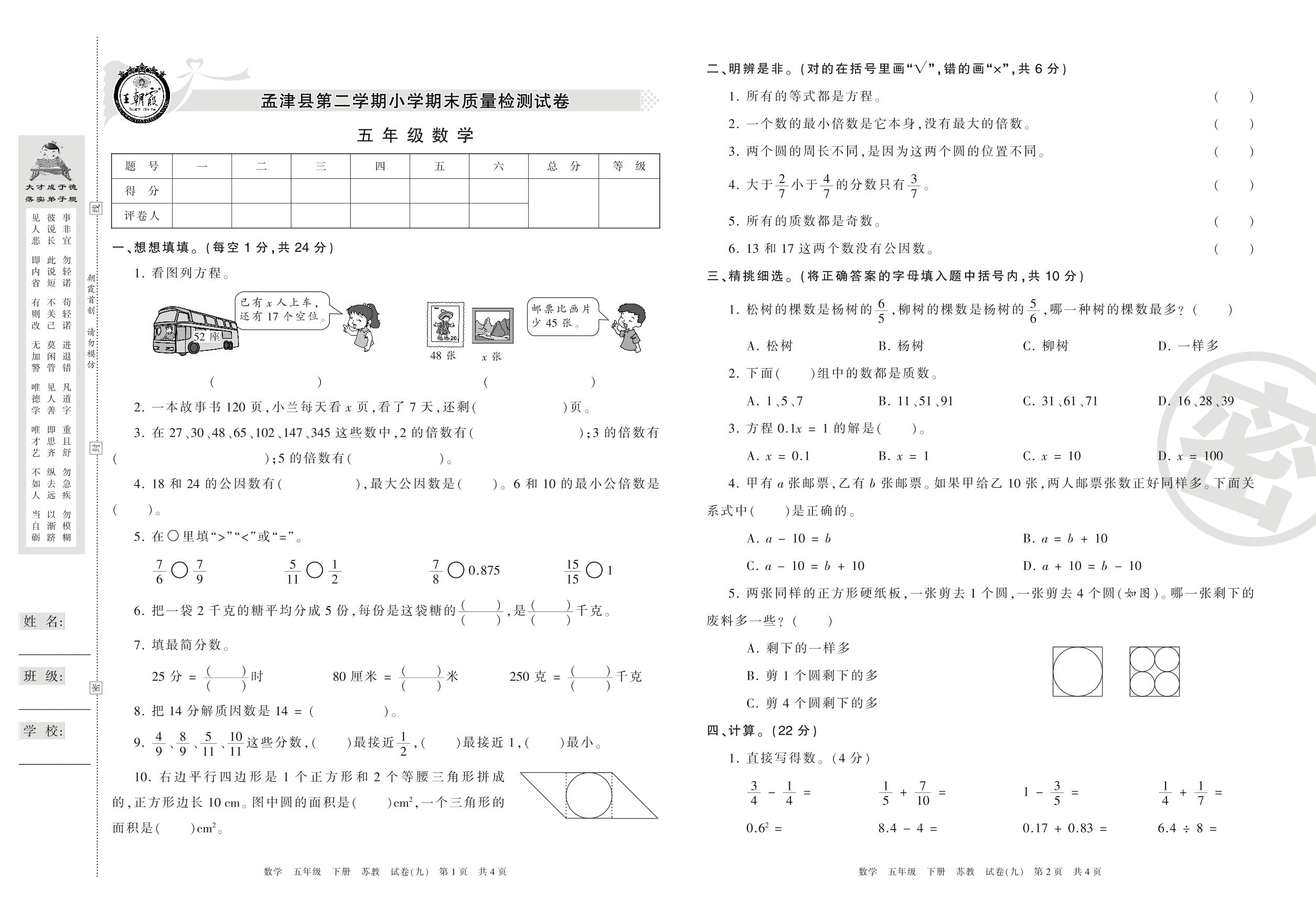 2015-2016学年第二学期洛阳市孟津县五年级数学试卷(苏教版)【9】