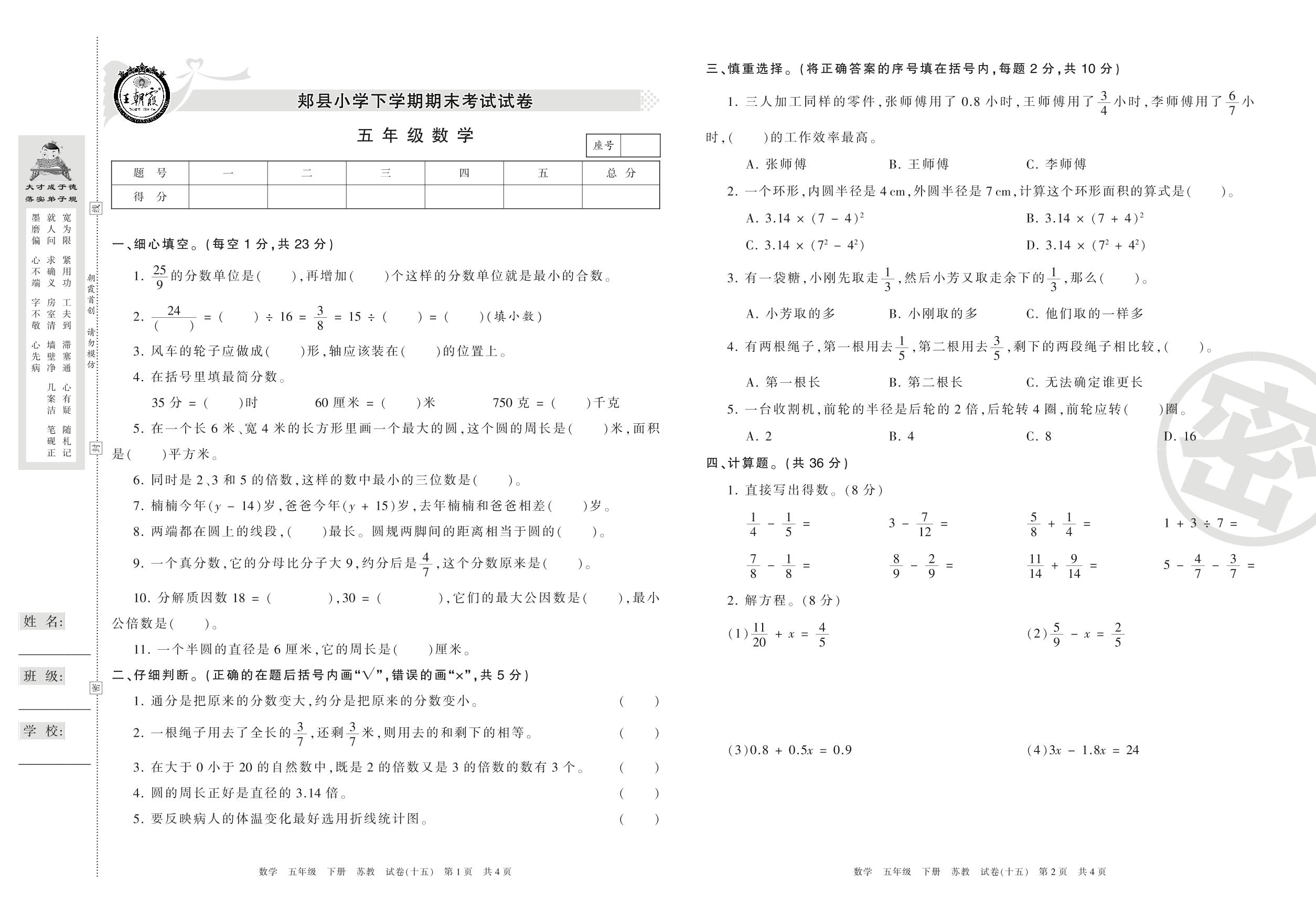 2015-2016学年第二学期平顶山市郏县五年级数学试卷(苏教版)【15】