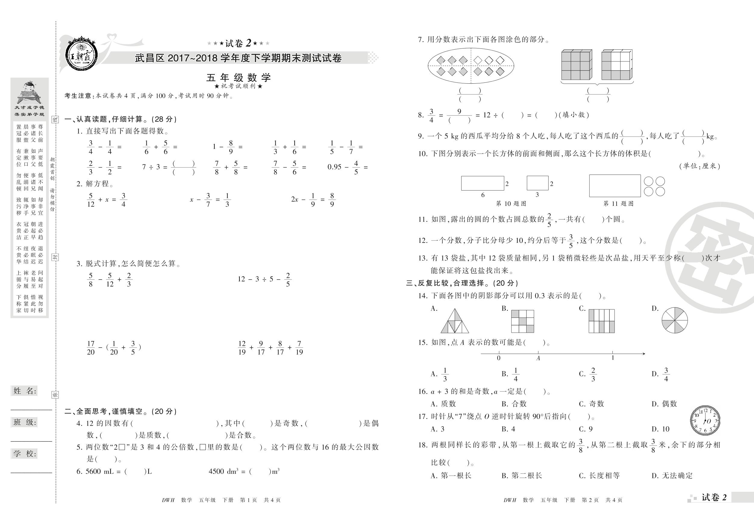 2017-2018学年第二学期武汉市武昌区五年级数学试卷(人教版)【2】