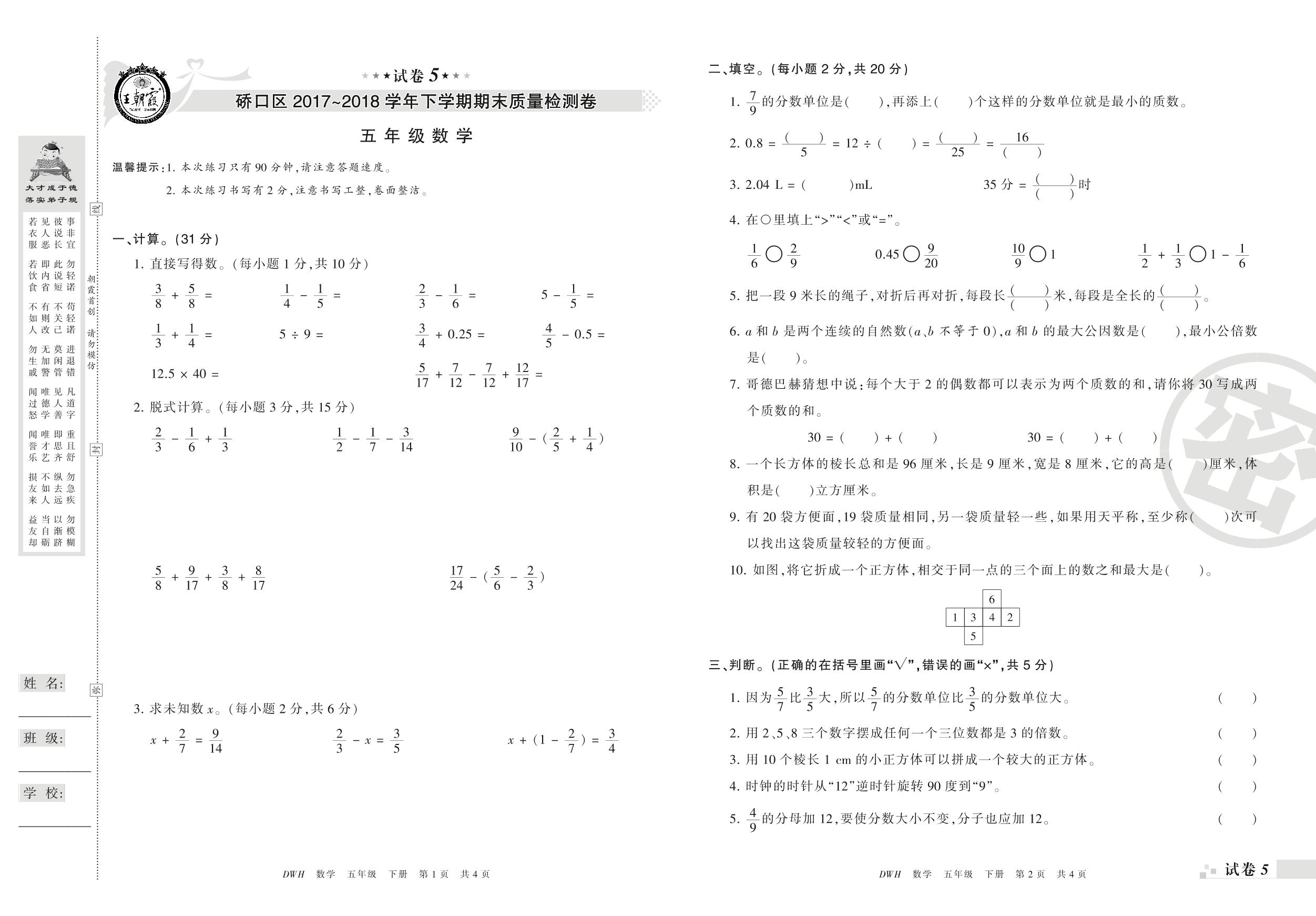 2017-2018学年第二学期武汉市硚口区五年级数学试卷(人教版)【5】