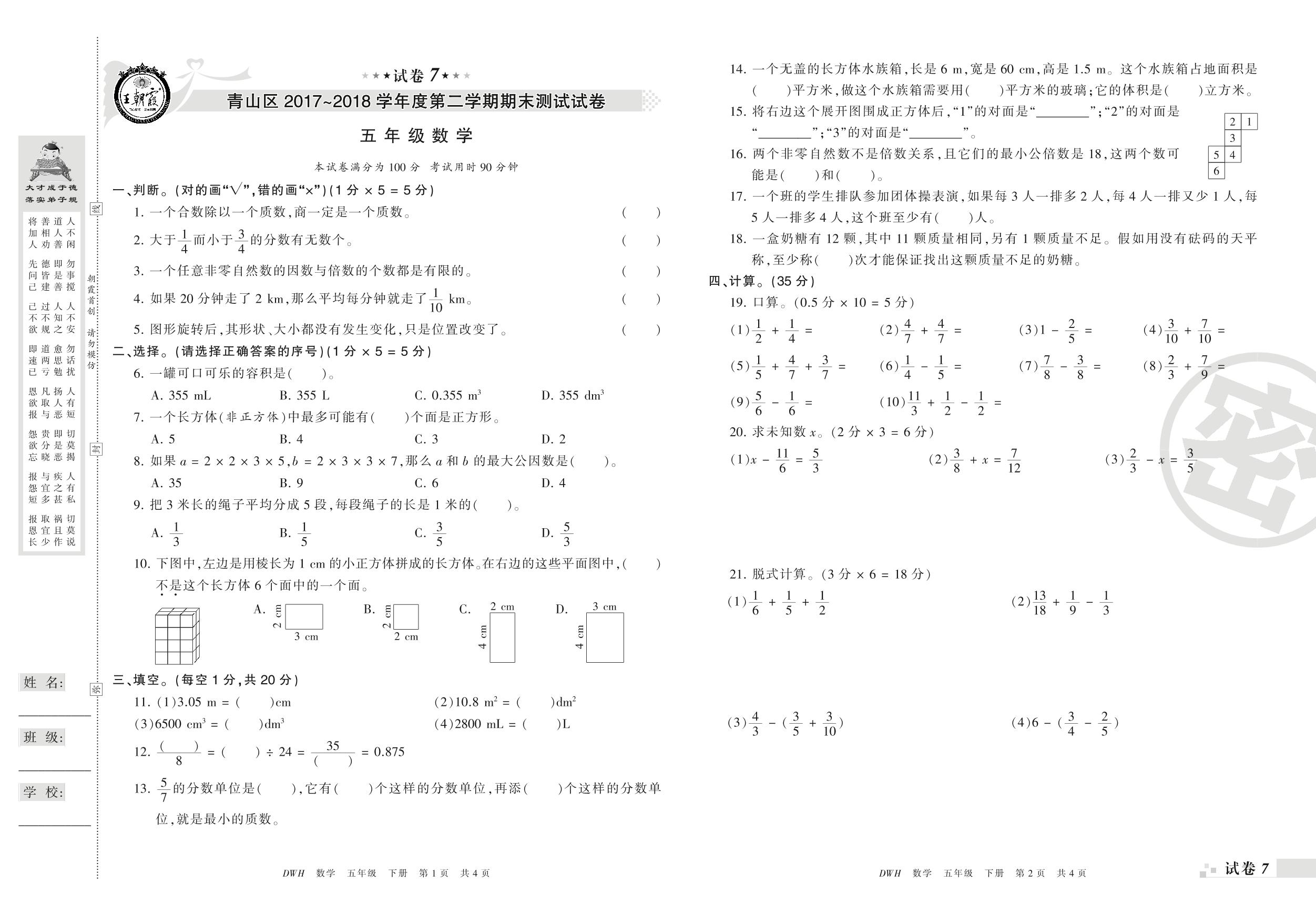 2017-2018学年第二学期武汉市青山区五年级数学试卷(人教版)【7】