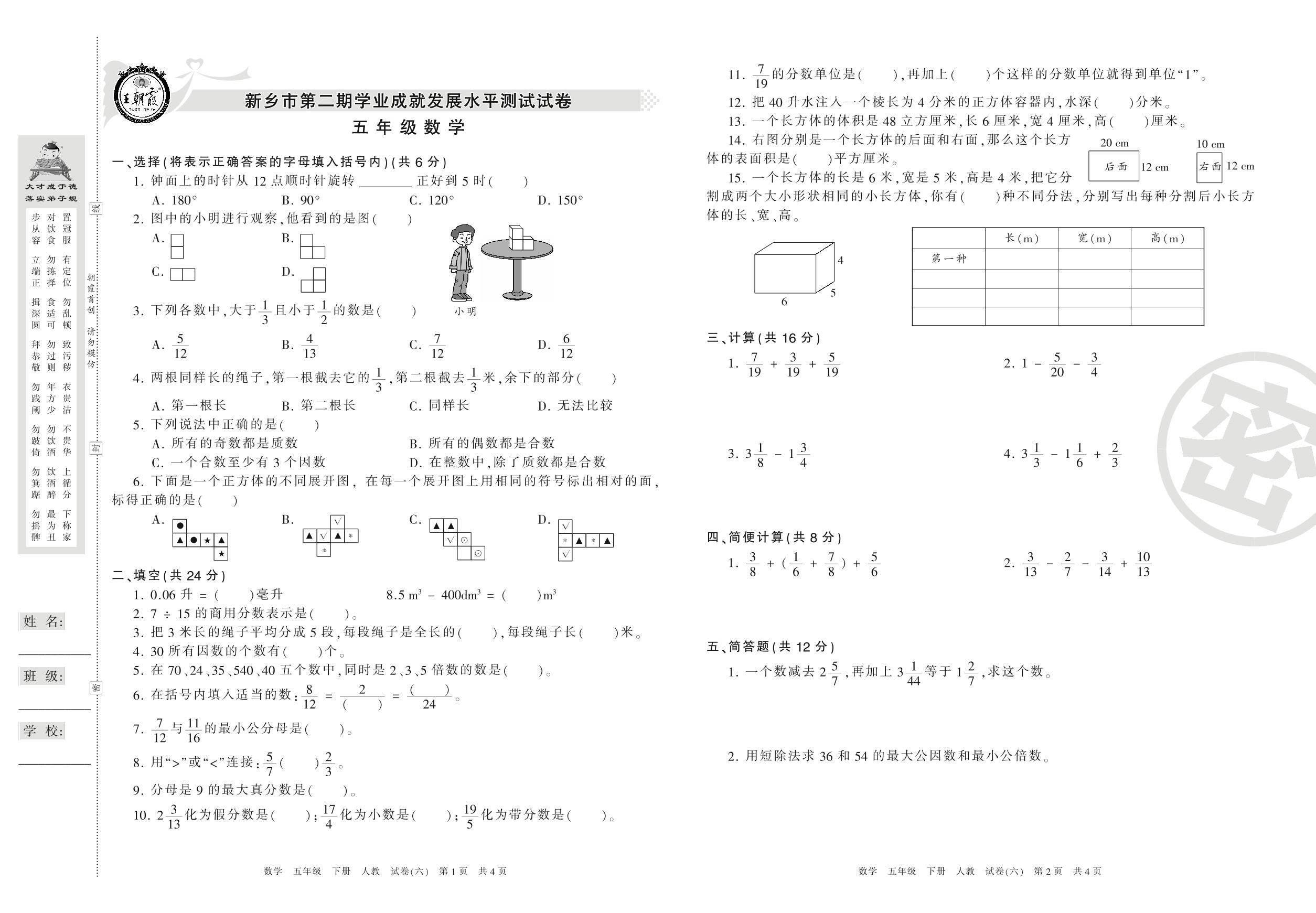 2015-2016学年第二学期新乡市五年级数学试卷(人教版)【6】