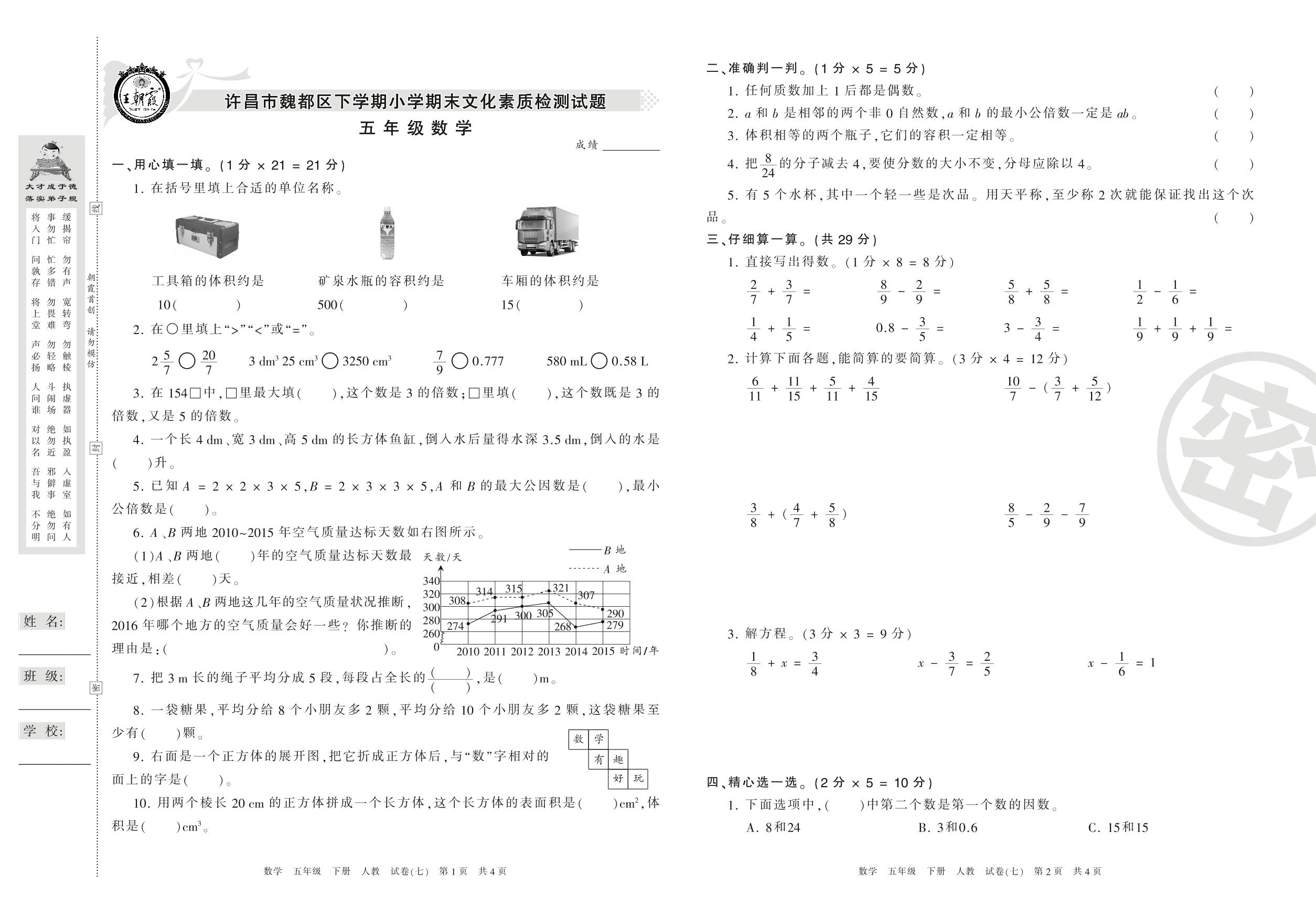 2015-2016学年第二学期许昌市魏都区五年级数学试卷(人教版)【7】