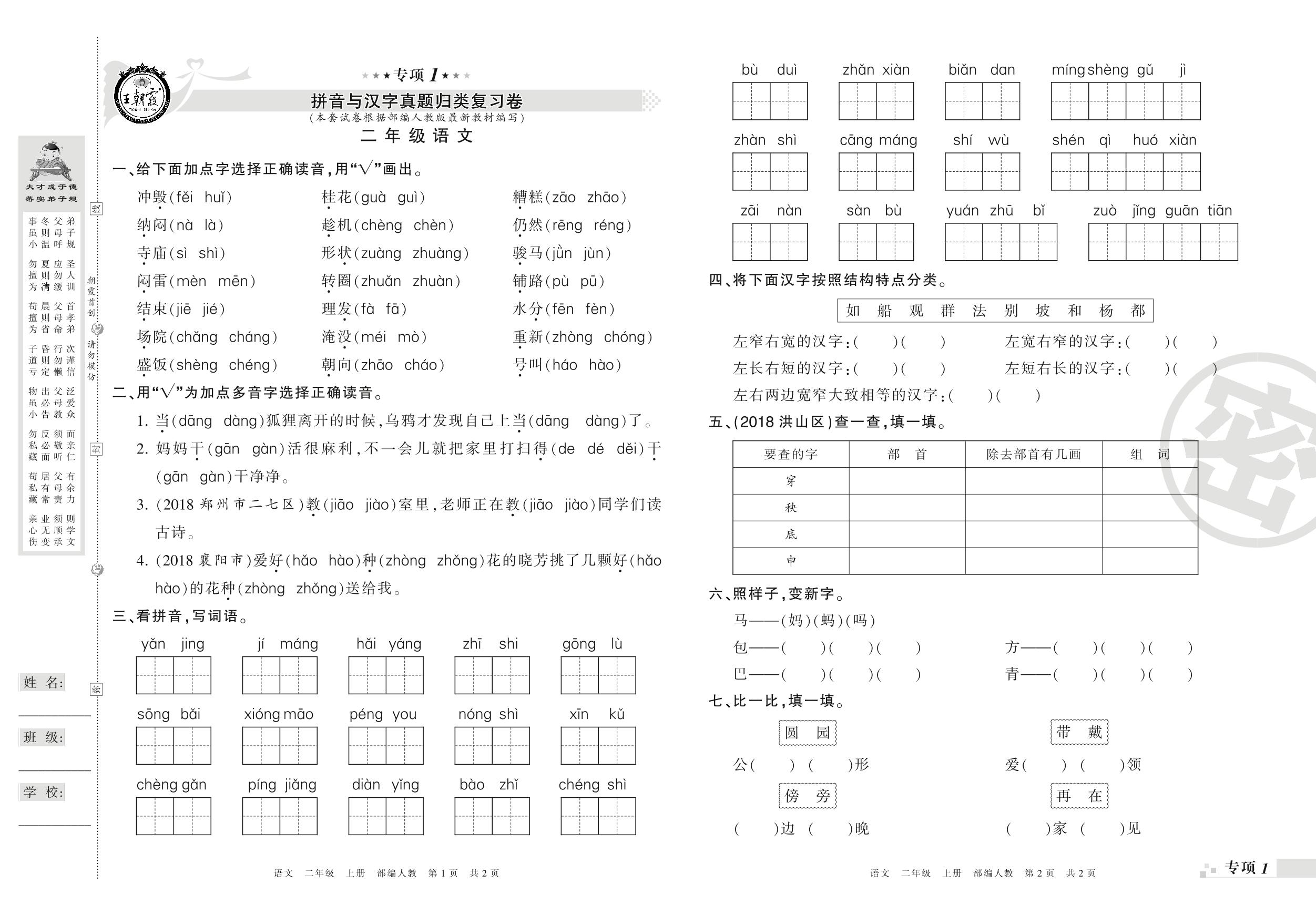 王朝霞期末专项卷——拼音与汉字、词语与句子真题归类复习卷二年级上册语文(人教版)_R21080171250【0】