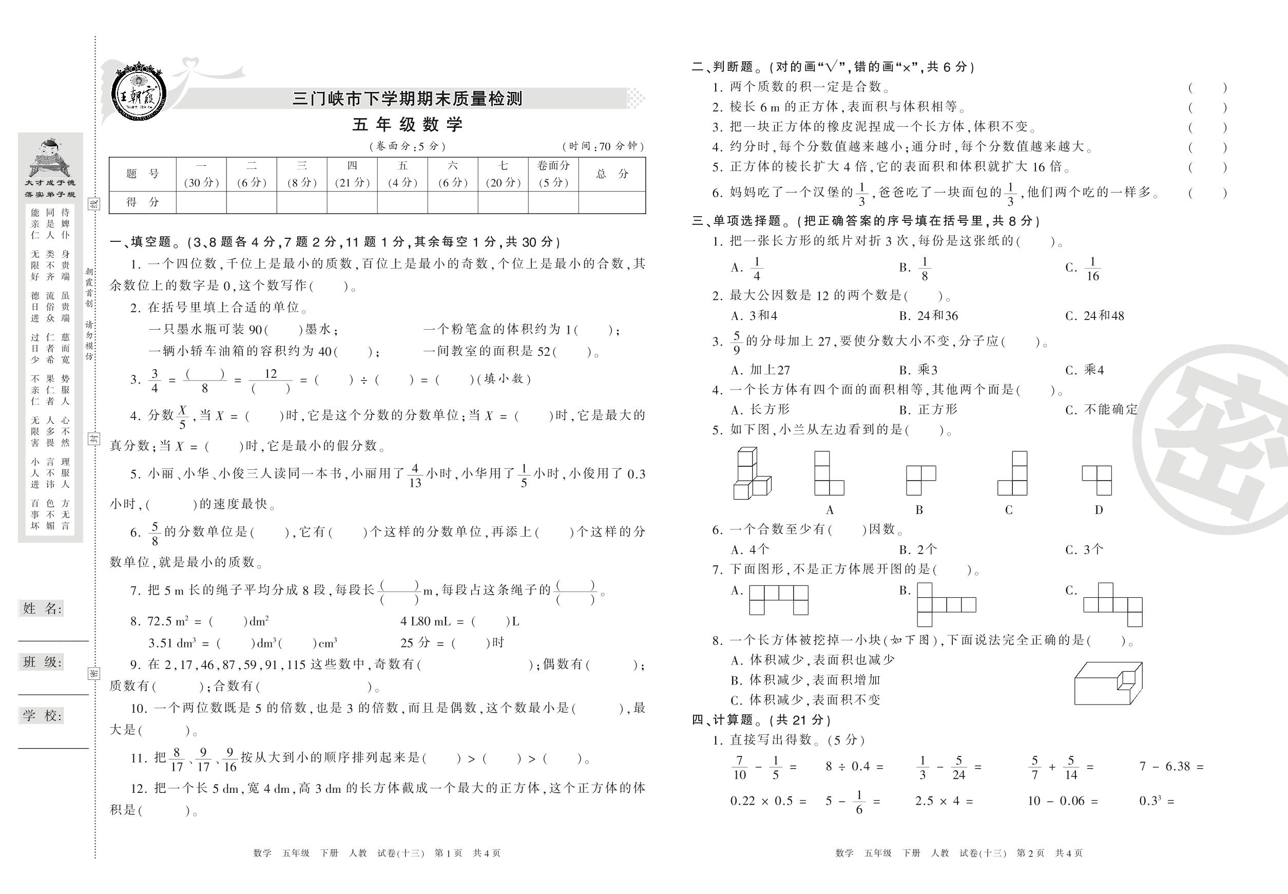 五年级数学人教版下册期末卷
