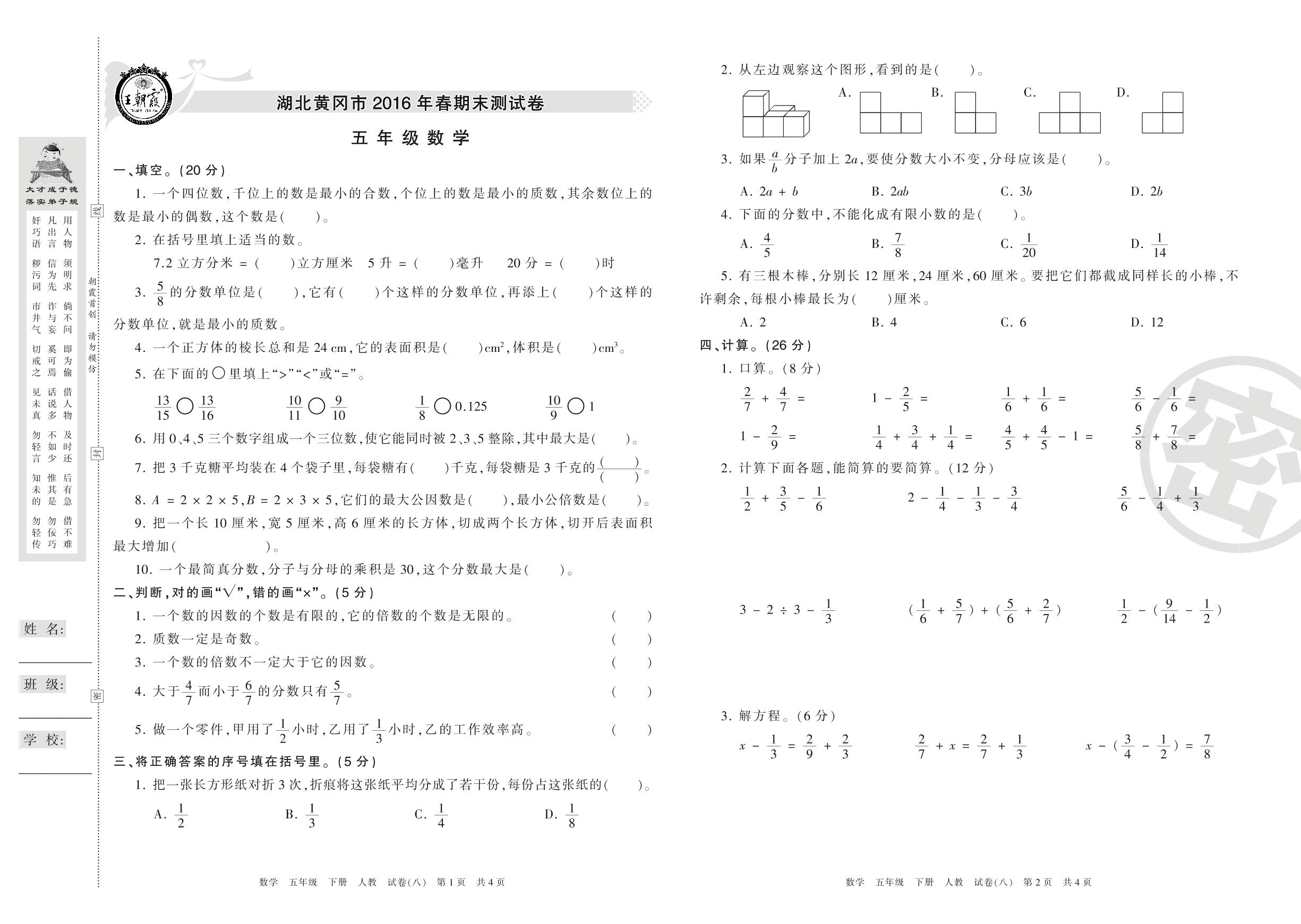 2015-2016学年第二学期湖北黄冈市五年级数学试卷(人教版)【8】