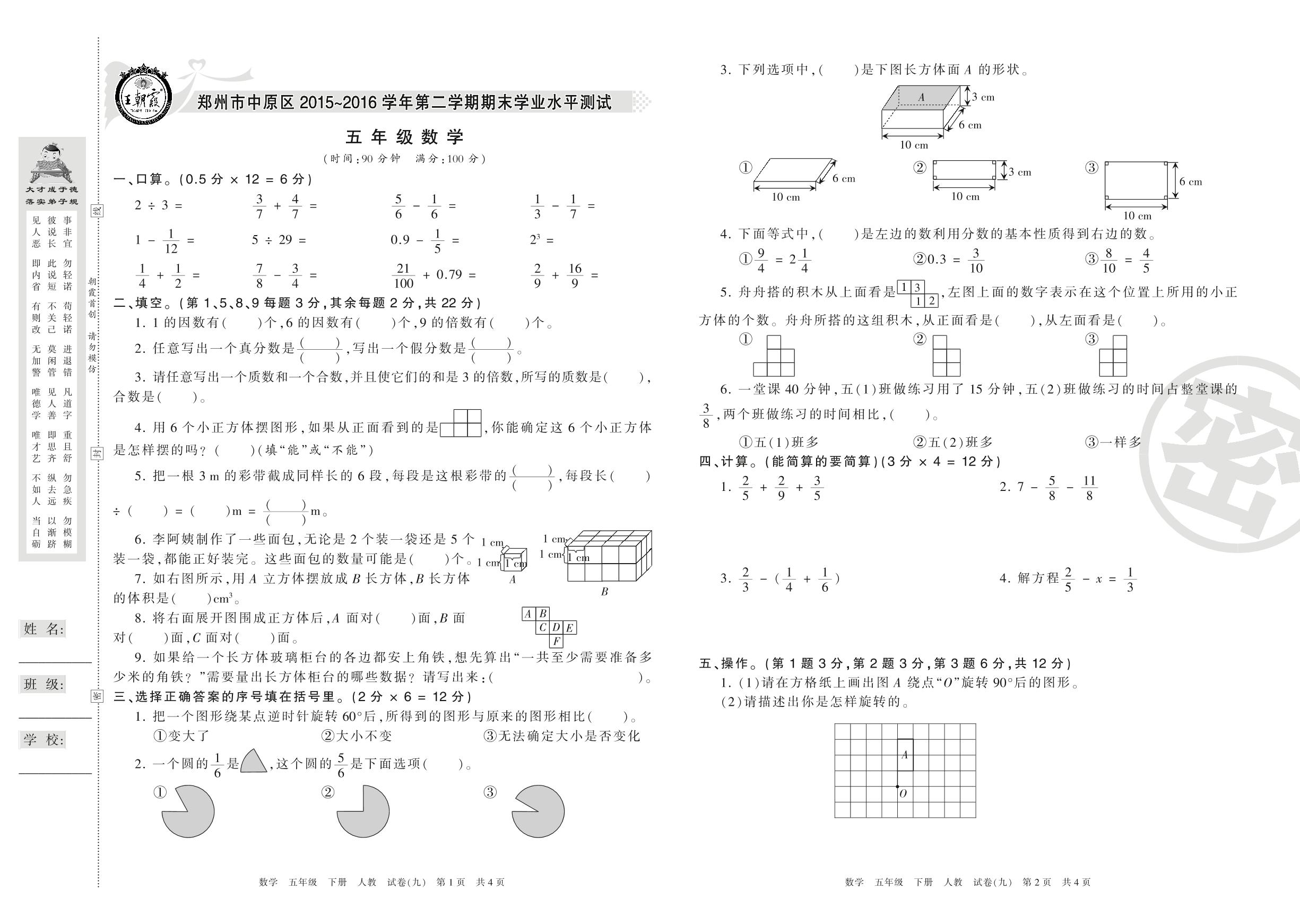 2015-2016学年第二学期郑州市中原区五年级数学试卷(人教版)【9】