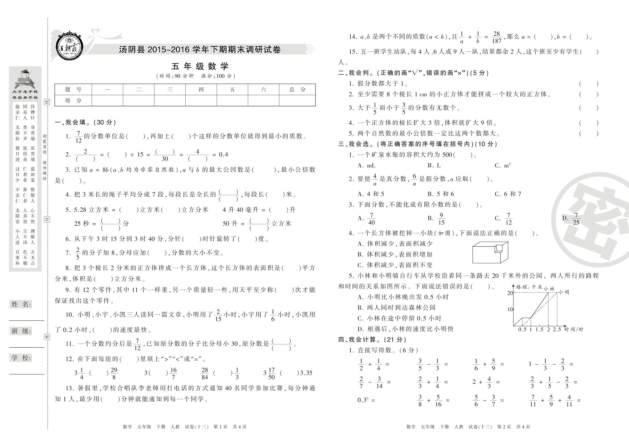 2015-2016学年第二学期安阳市汤阴县五年级数学试卷(人教版)【13】