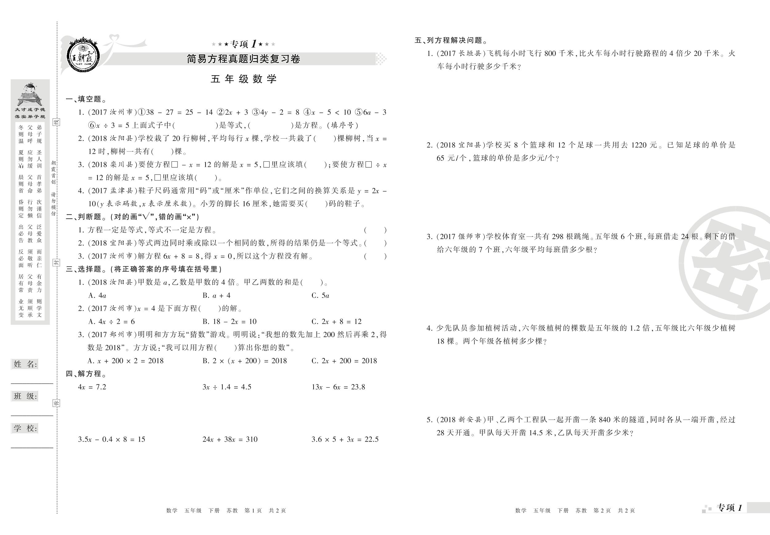 王朝霞期末专项卷——简易方程、因数与倍数真题归类复习卷五年级下册数学(苏教版)_R210804174224【0】