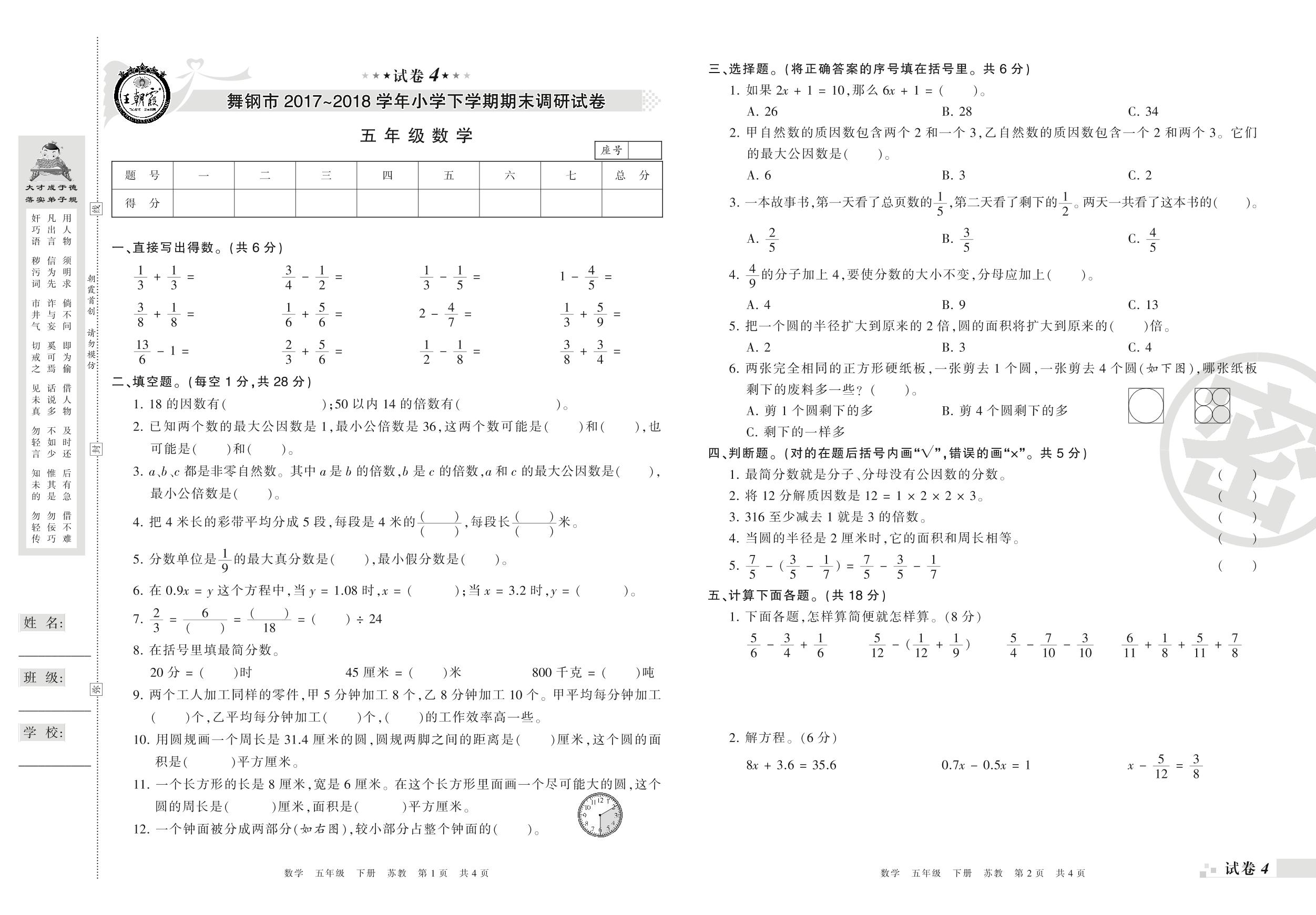 2017-2018学年第二学期舞钢市五年级数学试卷(苏教版)【4】