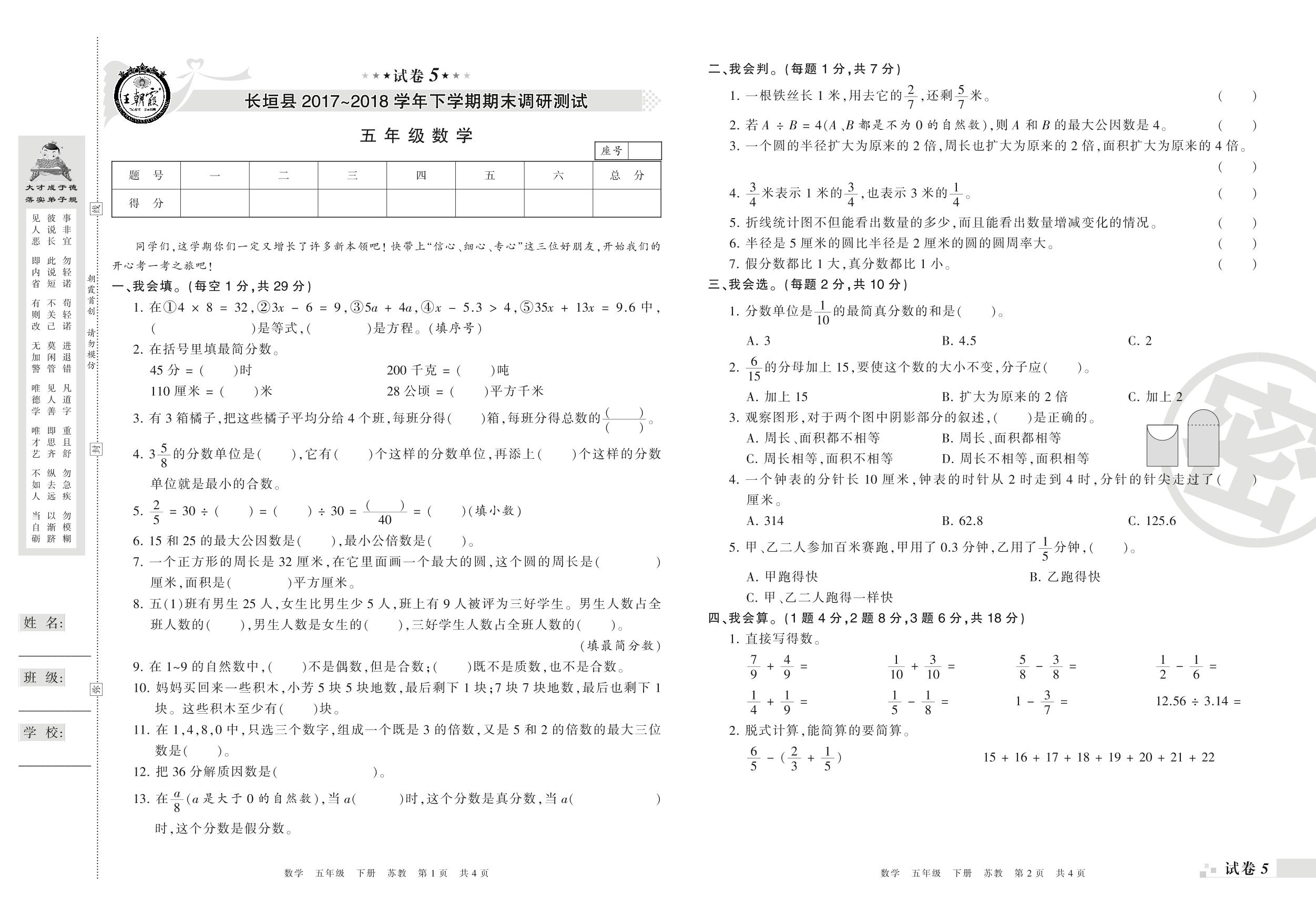 2017-2018学年第二学期长垣市五年级数学试卷(苏教版)【5】