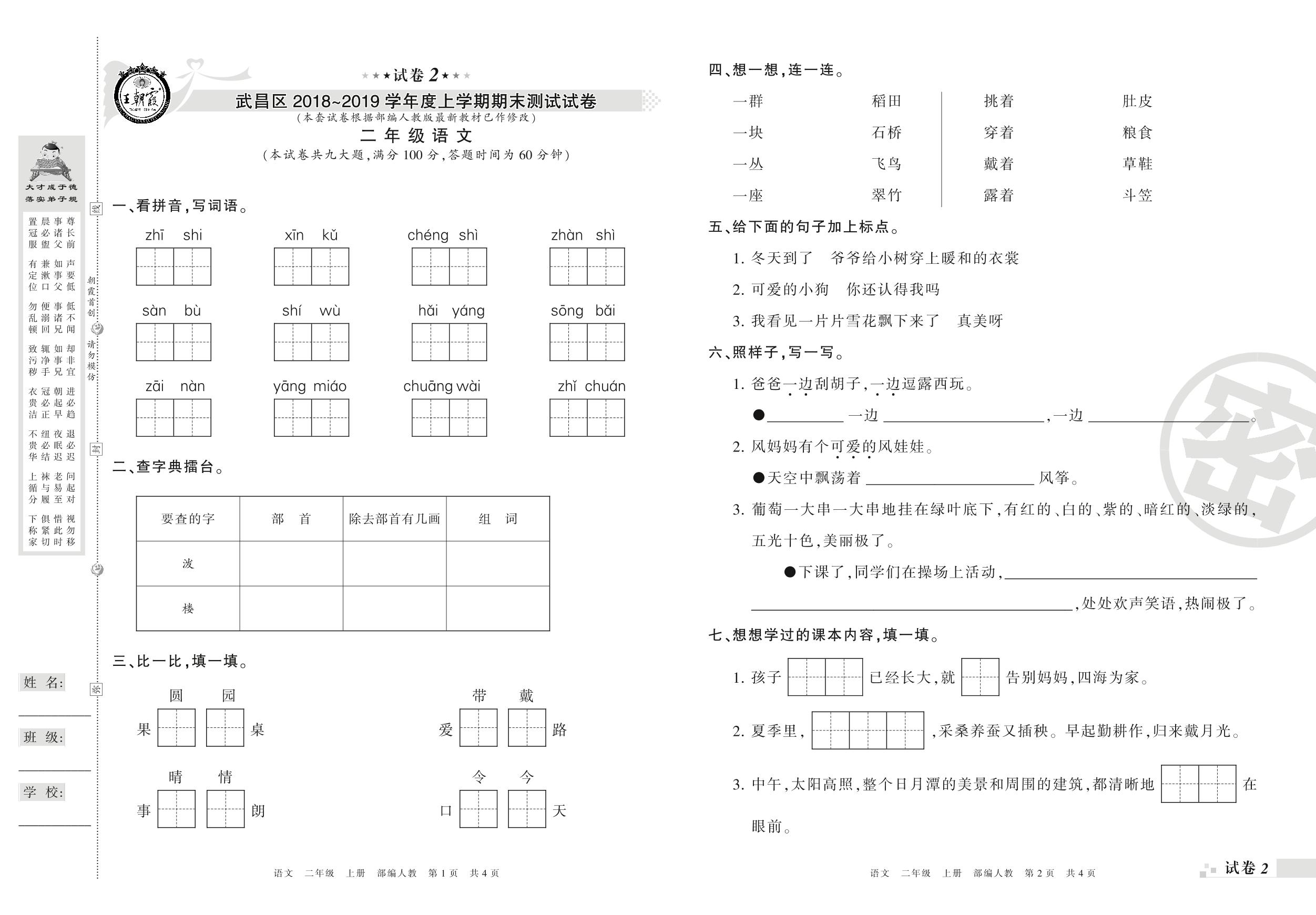 2018-2019学年第一学期武汉市武昌区二年级语文试卷(人教版)【2】