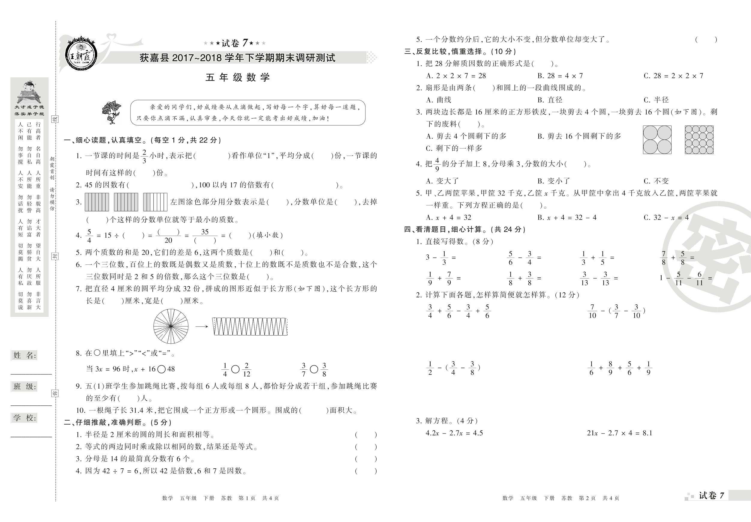 2017-2018学年第二学期新乡市获嘉县五年级数学试卷(苏教版)【7】