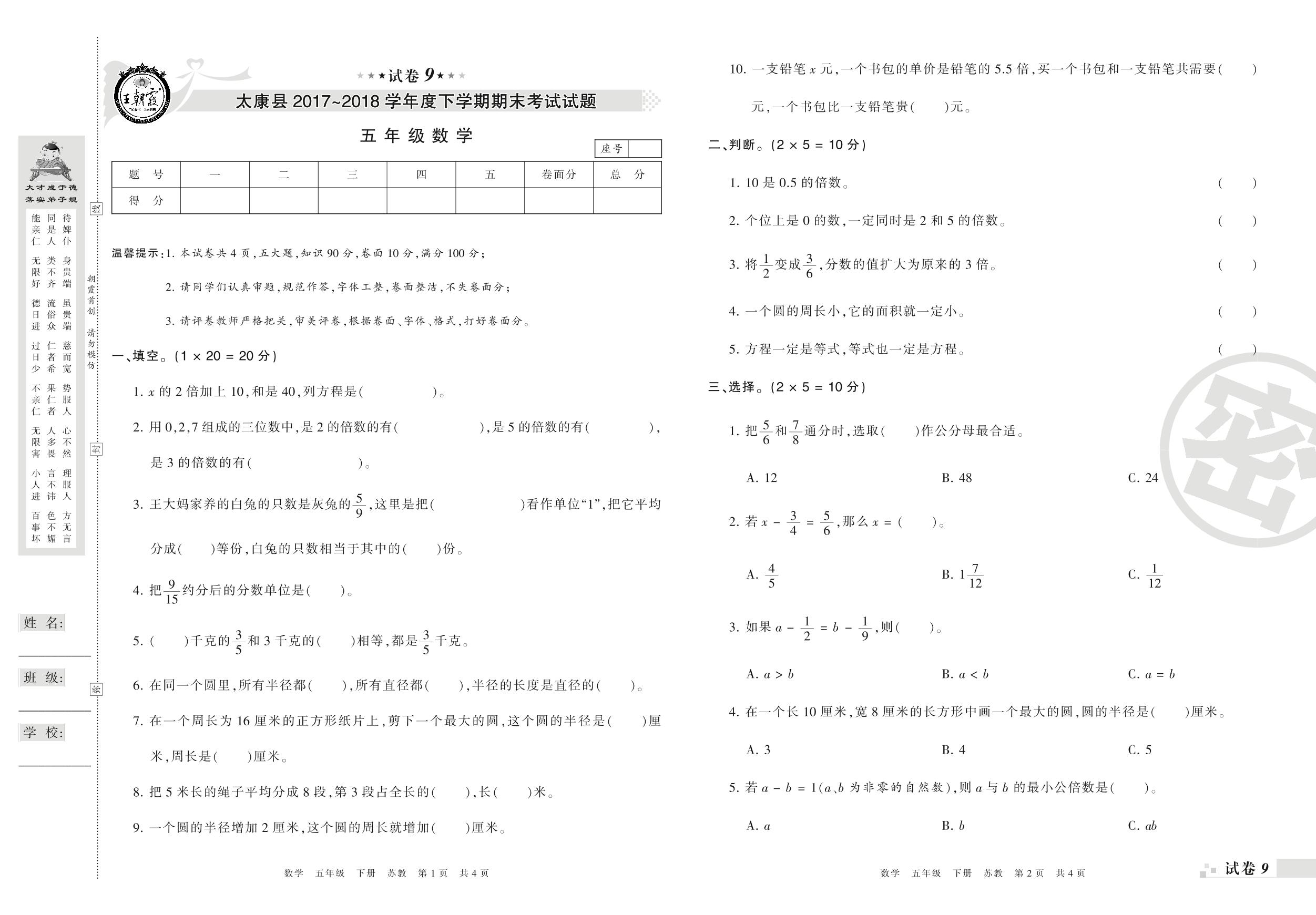 2017-2018学年第二学期周口市太康县五年级数学试卷(苏教版)【9】