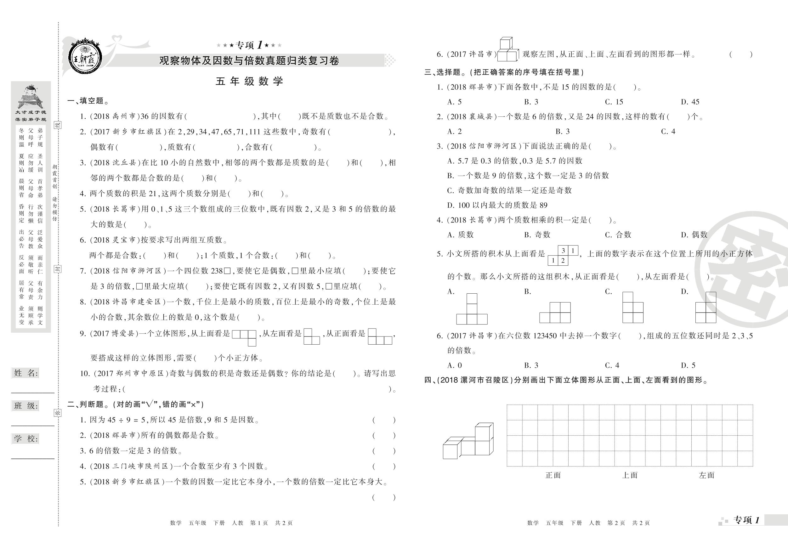 王朝霞期末专项卷——观察物体及因数与倍数、长方体和正方体真题归类复习卷五年级下册数学(人教版)_R210804174318【0】