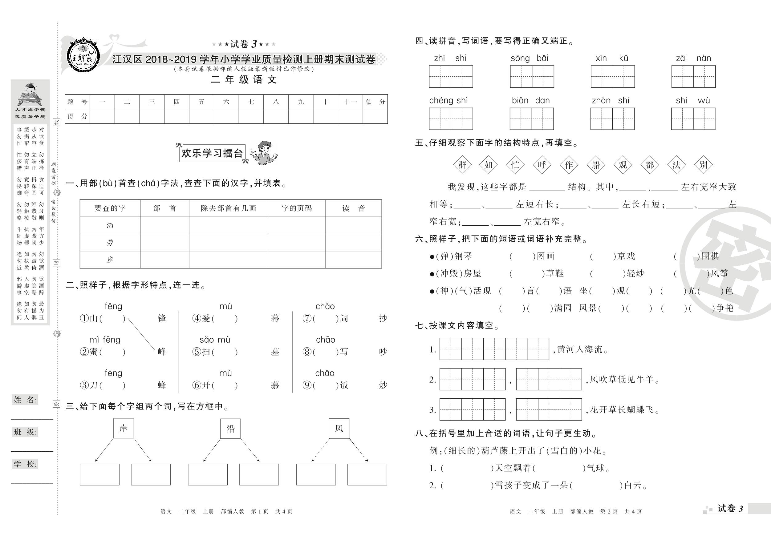 2018-2019学年第一学期武汉市江汉区二年级语文试卷(人教版)【3】